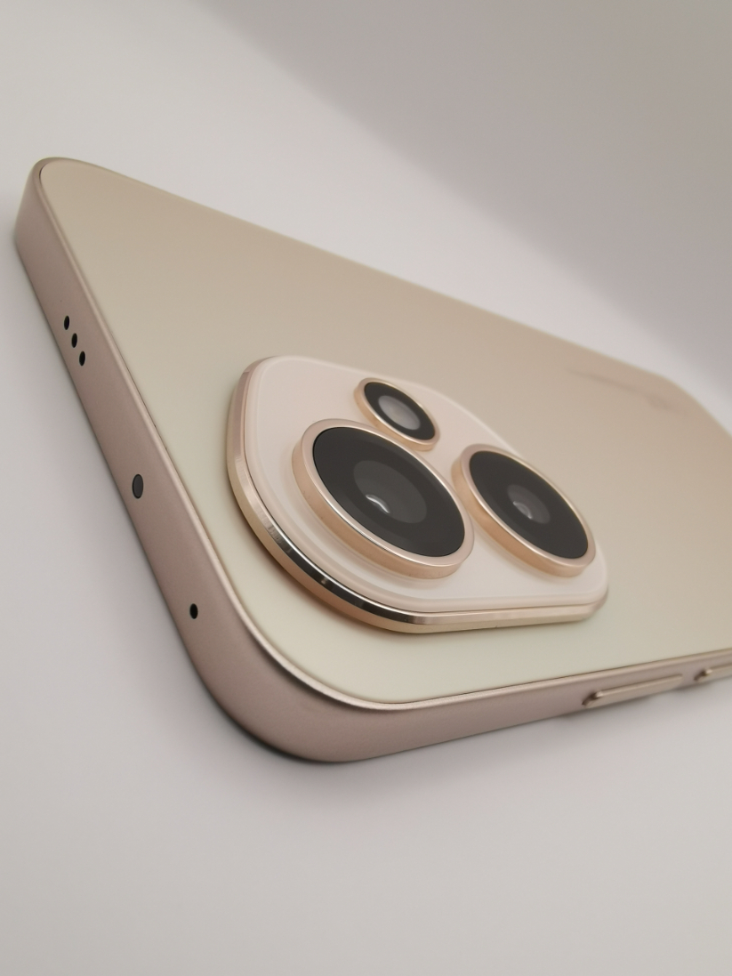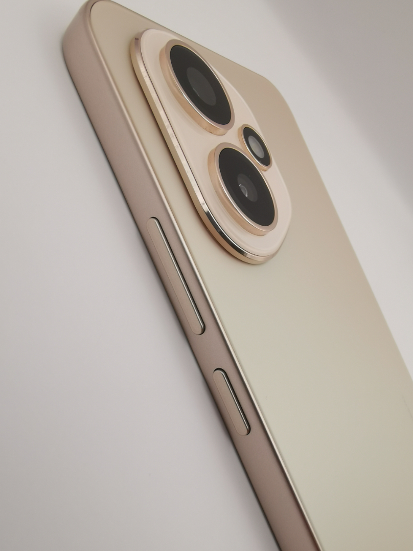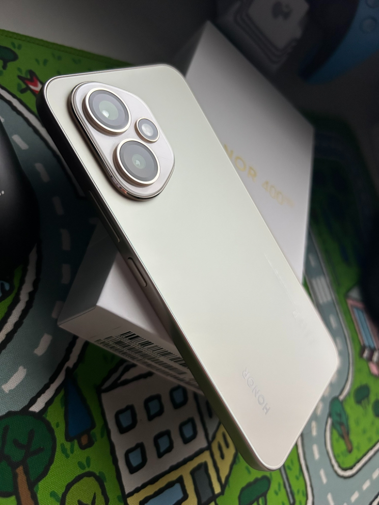 W moich rękach wylądował HONOR 400 w przecudownym złotym kolorze (Gold). Plecki zostały zachowane w matowej stylistyce, co sprawdza się, kiedy telefon używany jest bez dodatkowego etui, ponieważ nie zbiera odcisków palców. Niemniej jest to delikatny smartfon, który bez dodatkowej ochrony można bardzo szybko uszkodzić. Wizualnie również wyspa aparatów w złotych odcieniach bardzo przypadła mi do gustu.