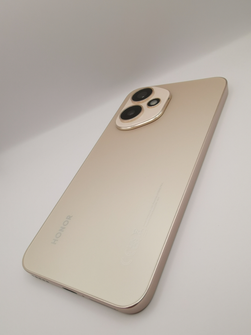 Smartfon ma bardzo smukłą obudowę i waży 184 g. Jego konstrukcja spełnia normę IP65 w zakresie ochrony przed kurzem i wodą. Trzymając go w dłoni bez etui, stwierdzam jednak, że jest śliski i trochę nieporęczny. Możliwe, że to odczucia wywołane korzystaniem na co dzień ze znacznie większego gabarytowo telefonu. Wyspa aparatów przypomina konstrukcję, jaką mogliście zaobserwować już np. w modelu HONOR 400 Pro. Dla różnicy tym razem otrzymaliśmy wyłącznie dwa obiektywy.