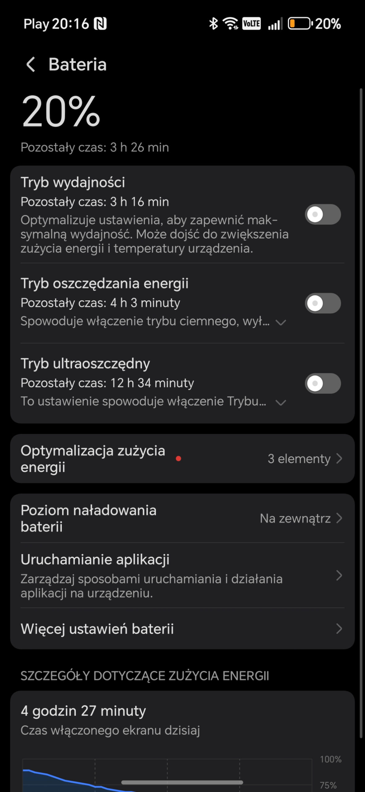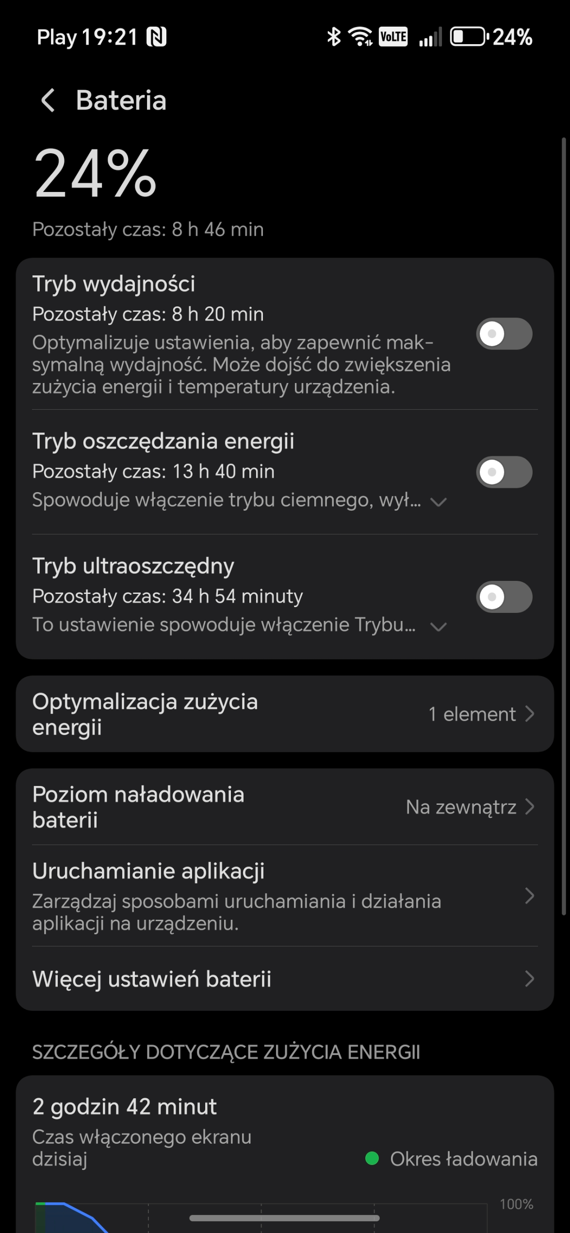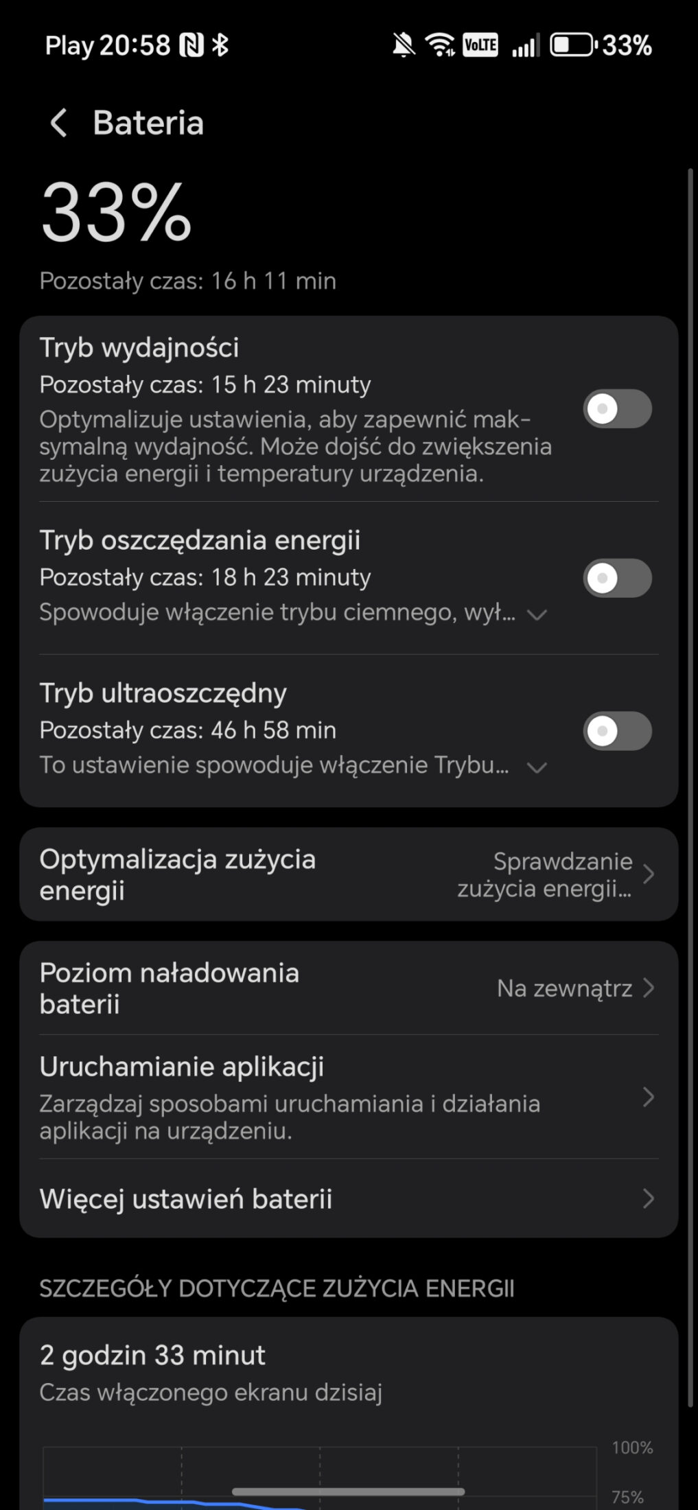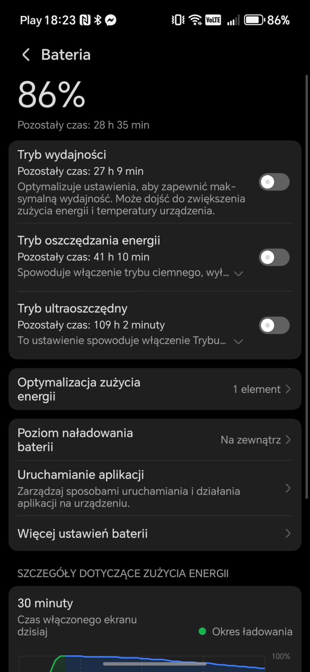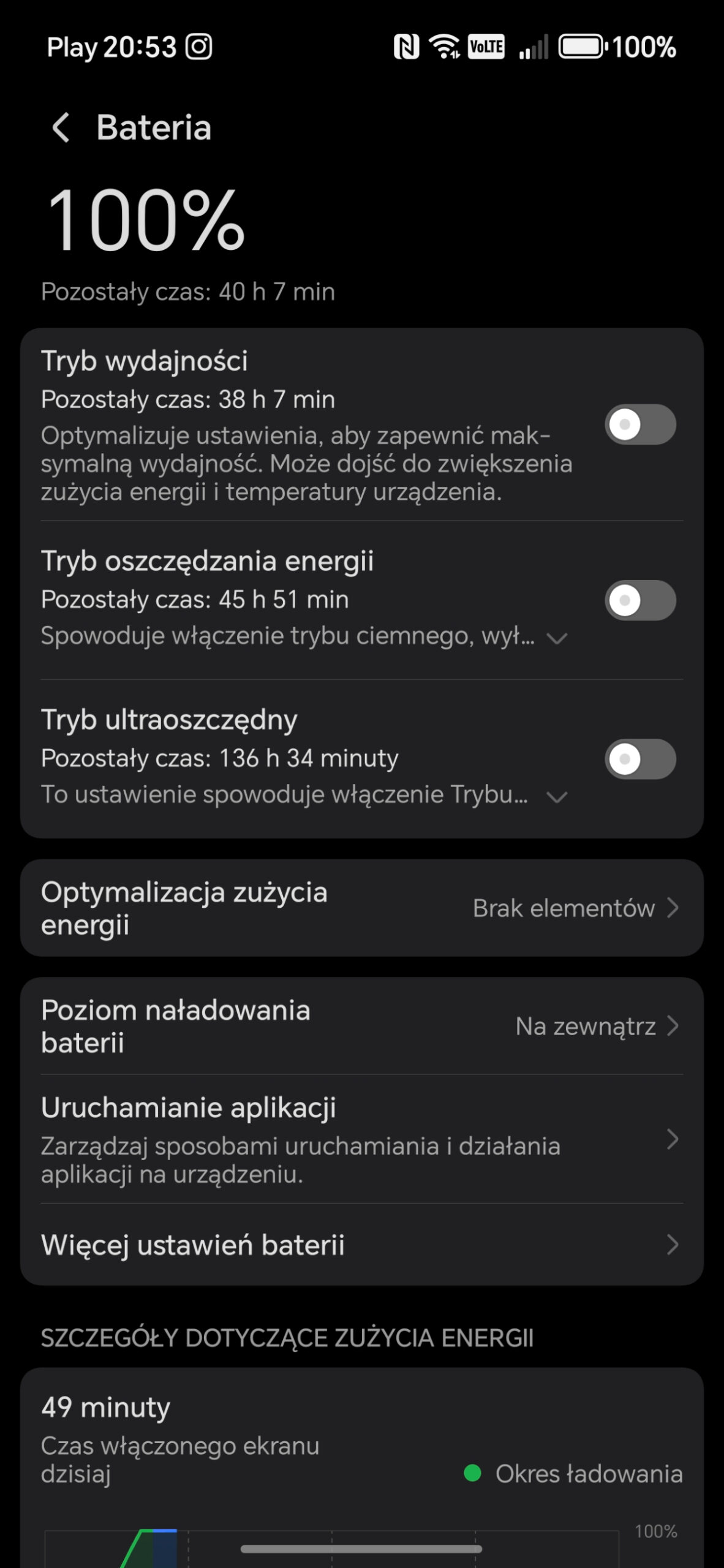 W zależności od sposobu korzystania z urządzenia na co dzień, jest ono w stanie wytrzymać do 1.5 dnia na jednym ładowaniu. W trybie czuwania przetrwa nawet do kilku dni. Warto również pamiętać, że ustawienia jasności, częstotliwości odświeżania i ciągle aktywnego ekranu znacząco wpływają na zużywanie baterii.