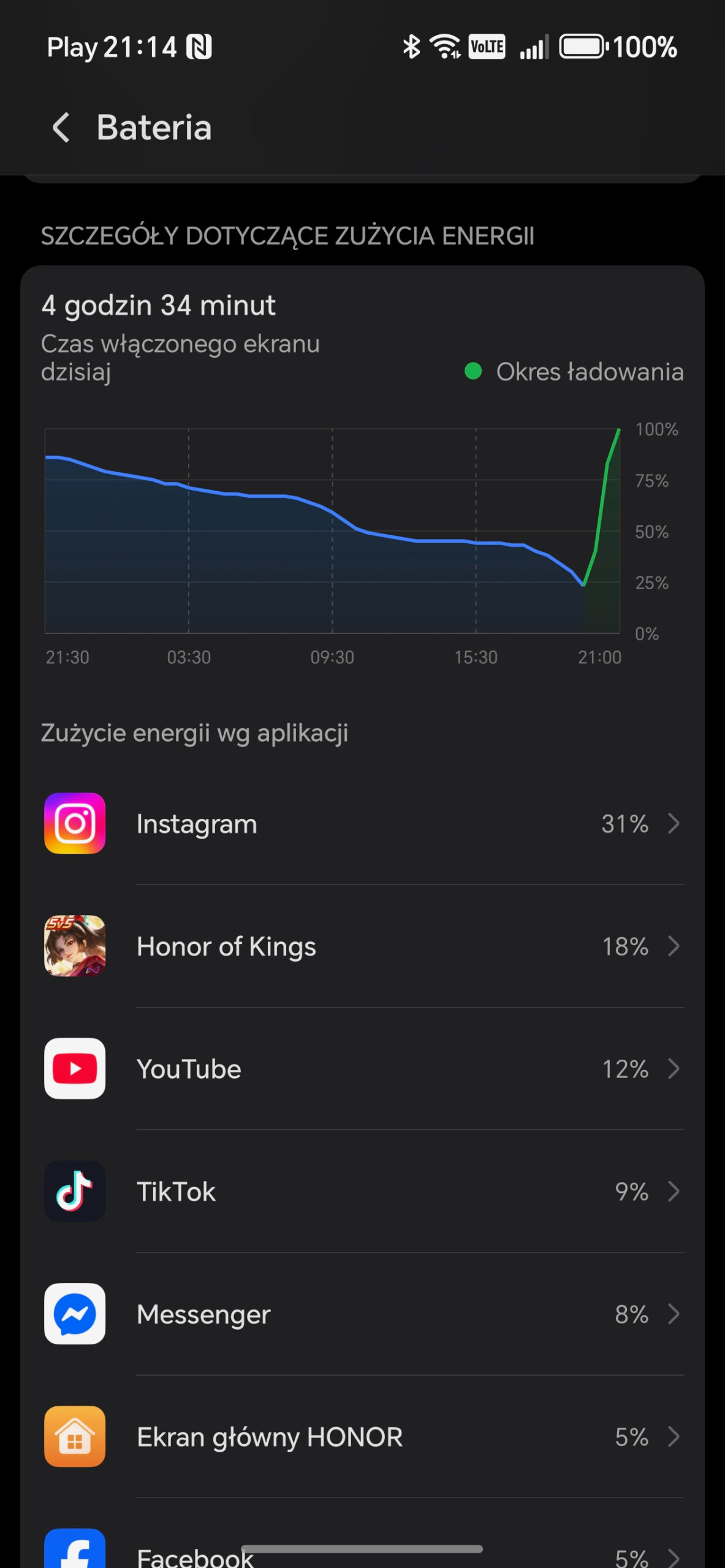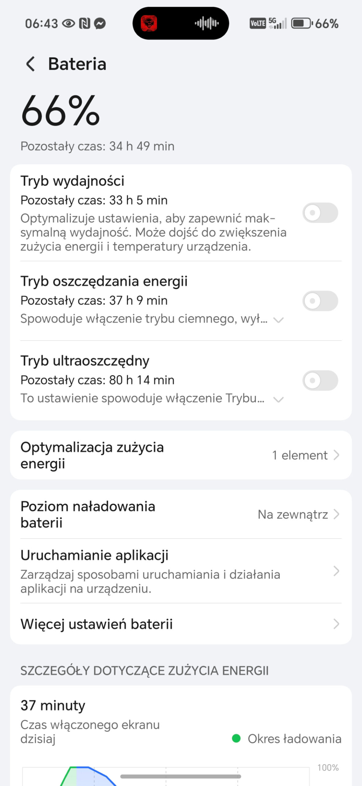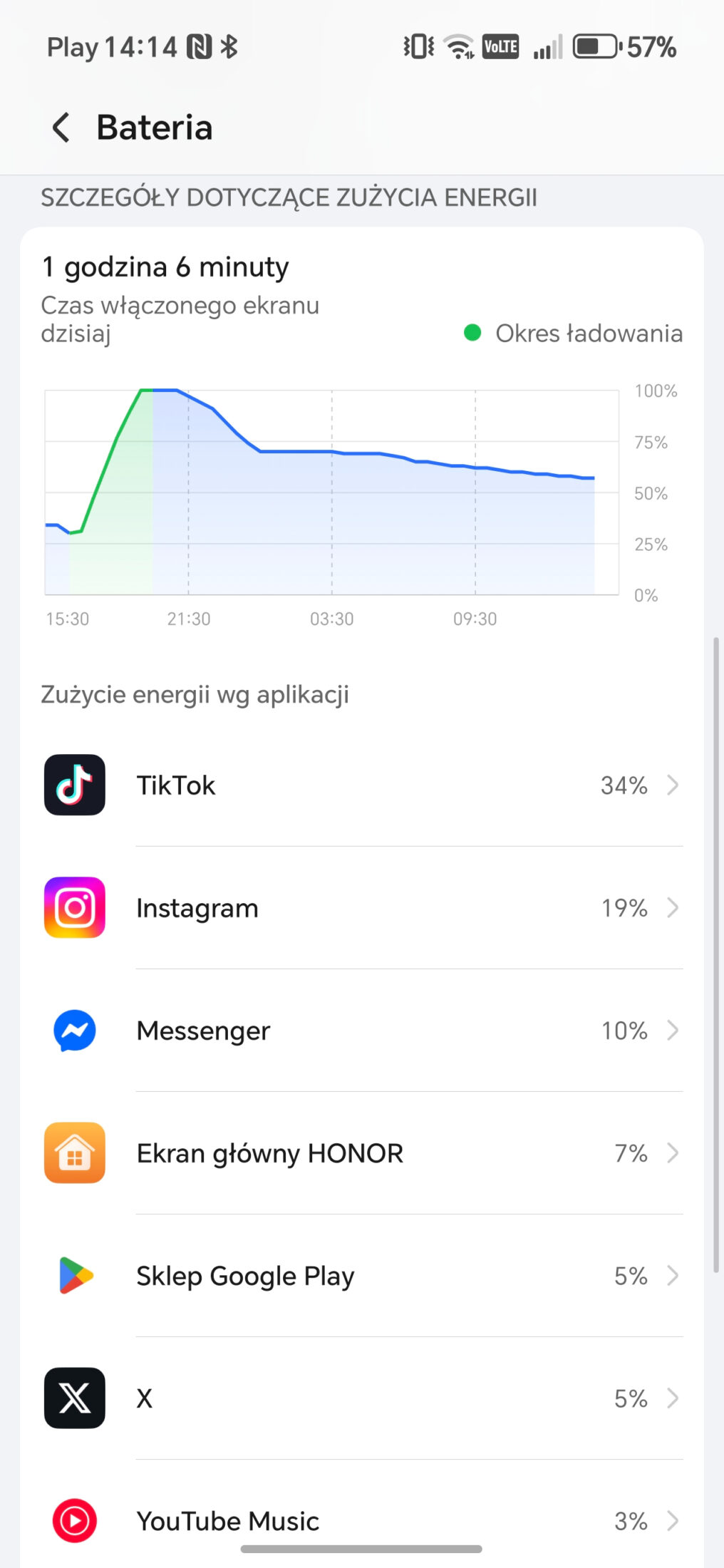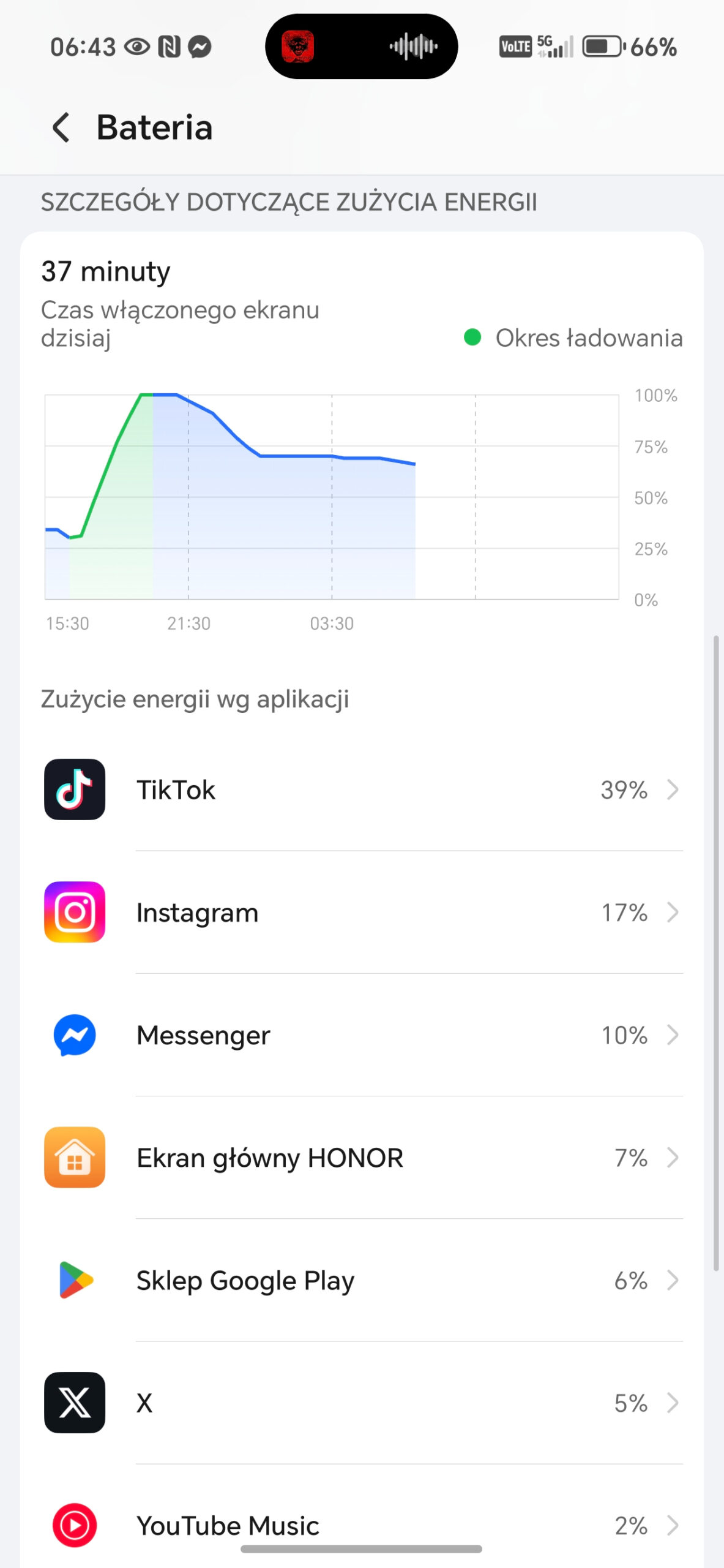Telefon korzysta z krzemowo-węglowej baterii o pojemności 5300 mAh. Wspiera ono przewodowe ładowanie 66W HONOR Wired SuperCharge, więc można ją naładować do pełna w mniej niż godzinę. Producent zapewnia, że po czterech latach używania zachowa ponad 80% pierwotnej pojemności. Więcej o tym powiedzą zapewne użytkownicy, którzy właśnie tyle czasu będą korzystać z urządzenia. Co ważne, by móc cieszyć się szybkim ładowaniem, potrzebujemy odpowiednio mocne kostki. Bez tego czas ładowania wydłuża się znacząco do niemal dwóch godzin.