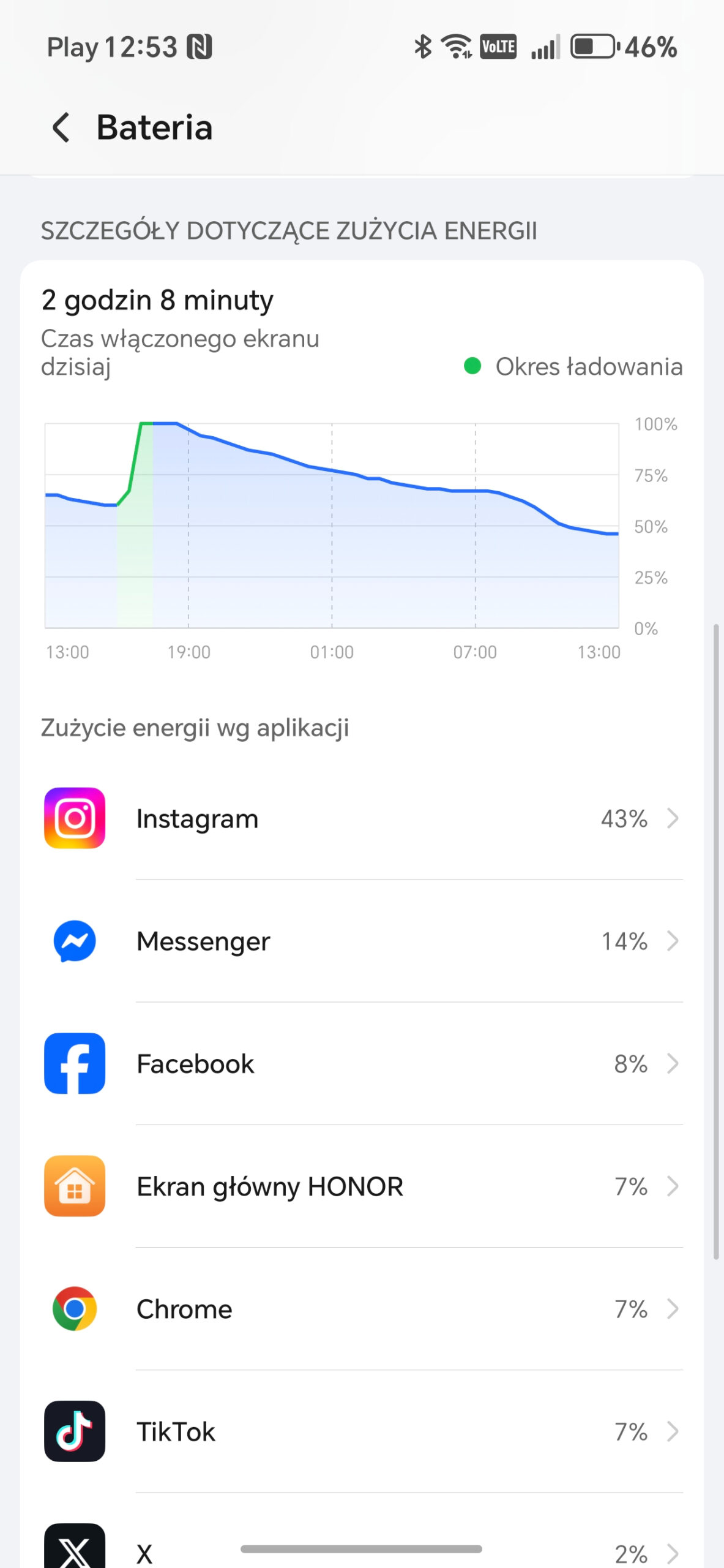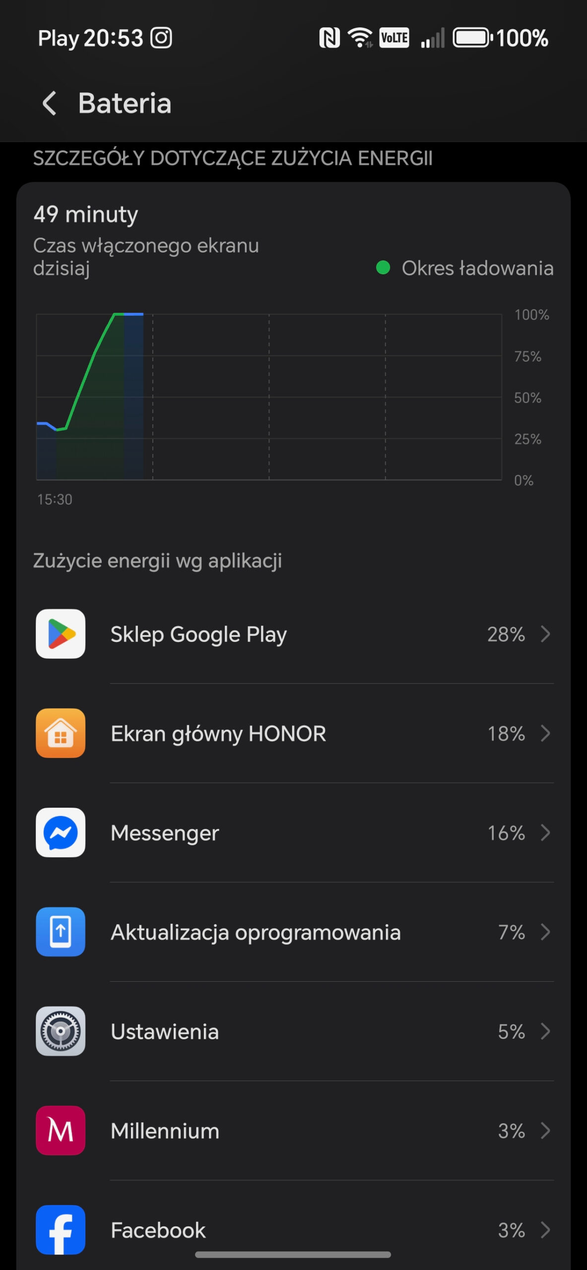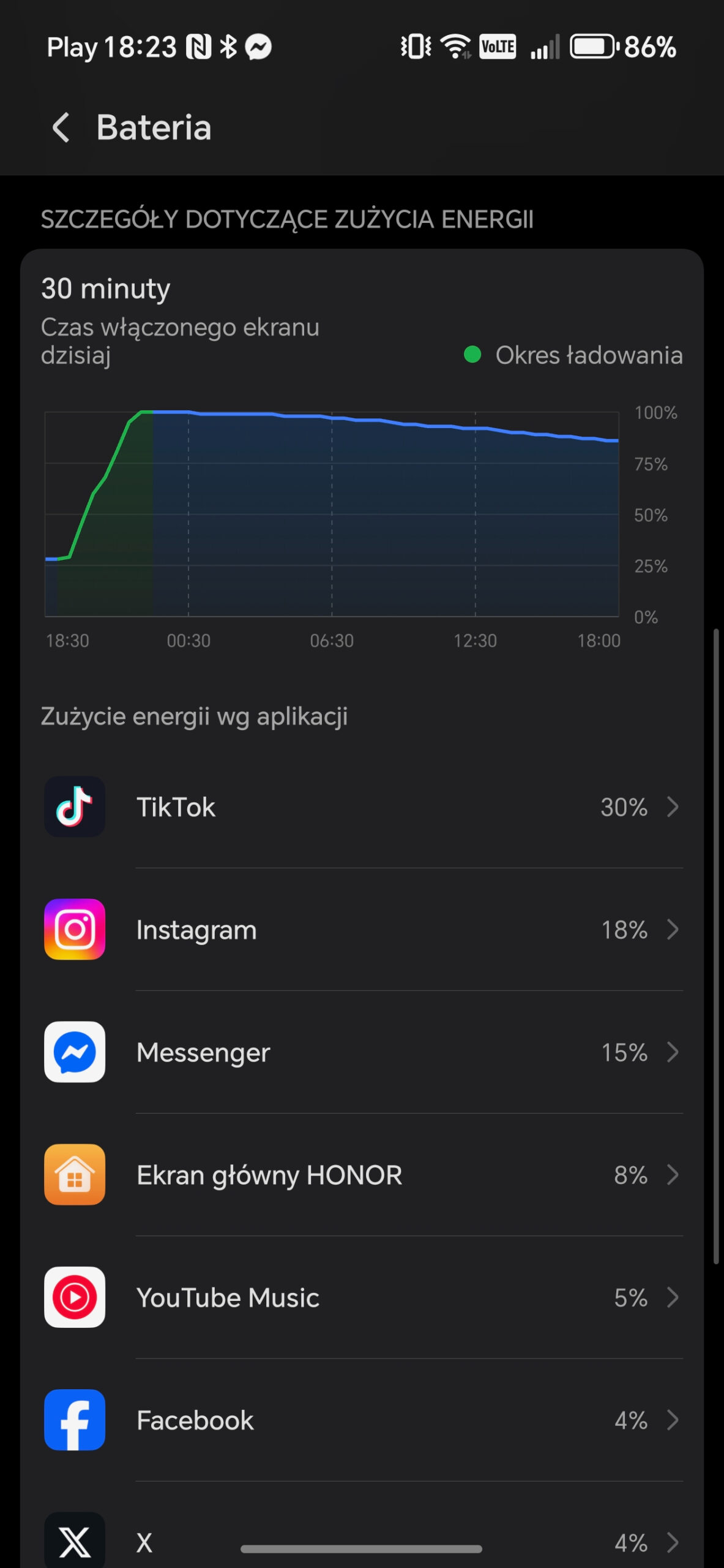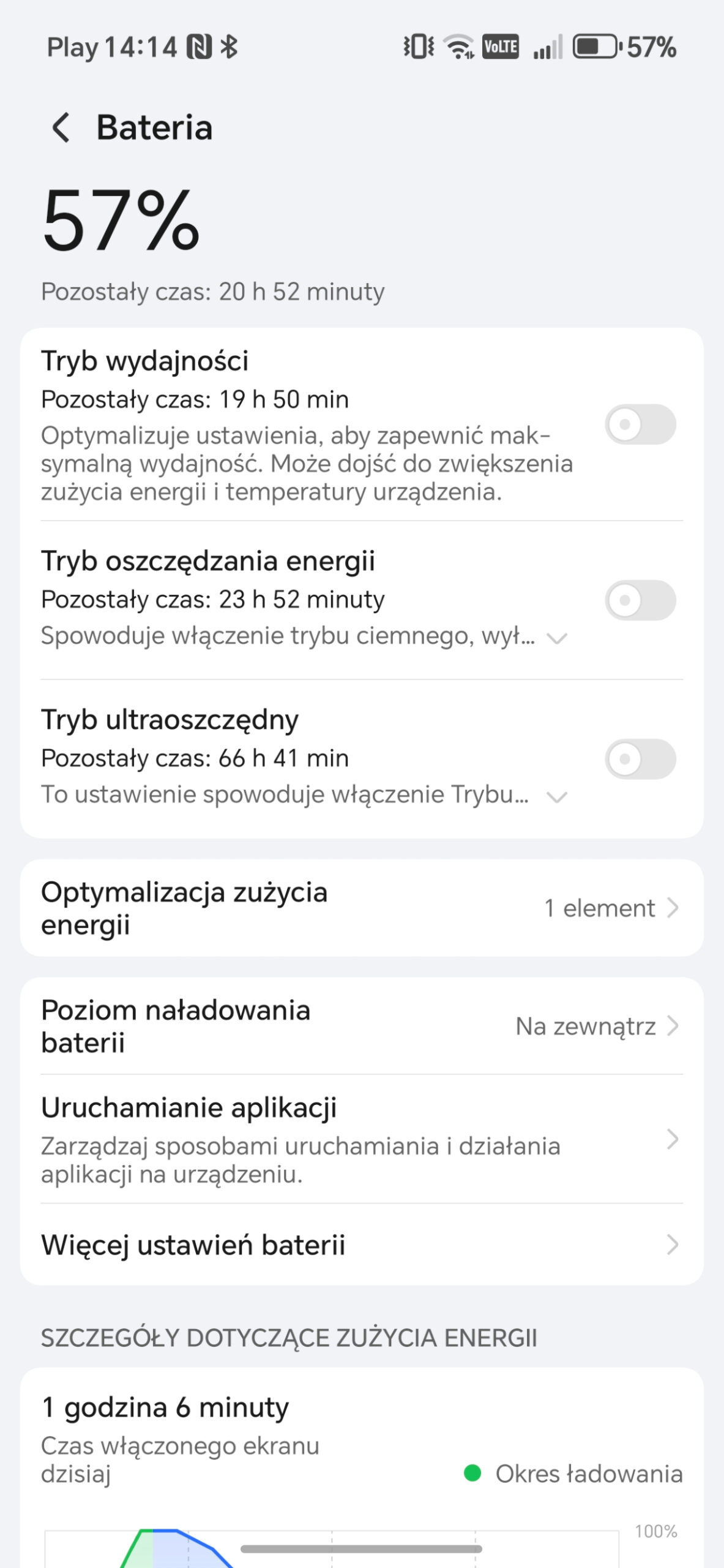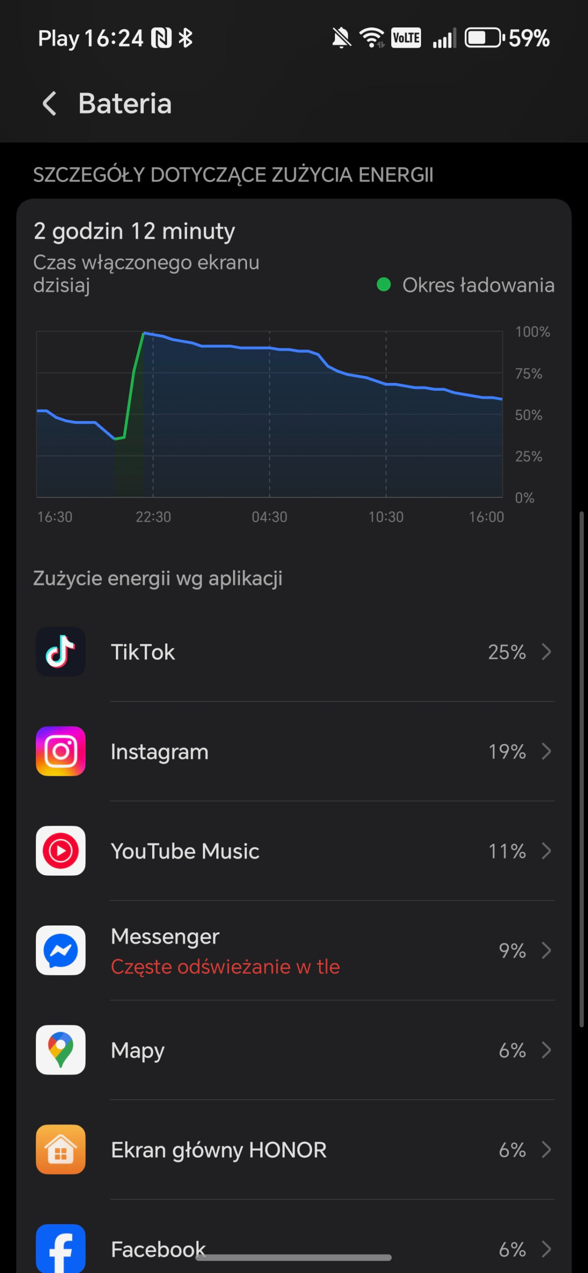 Telefon korzysta z krzemowo-węglowej baterii o pojemności 5300 mAh. Wspiera ono przewodowe ładowanie 66W HONOR Wired SuperCharge, więc można ją naładować do pełna w mniej niż godzinę. Producent zapewnia, że po czterech latach używania zachowa ponad 80% pierwotnej pojemności. Więcej o tym powiedzą zapewne użytkownicy, którzy właśnie tyle czasu będą korzystać z urządzenia. Co ważne, by móc cieszyć się szybkim ładowaniem, potrzebujemy odpowiednio mocne kostki. Bez tego czas ładowania wydłuża się znacząco do niemal dwóch godzin.