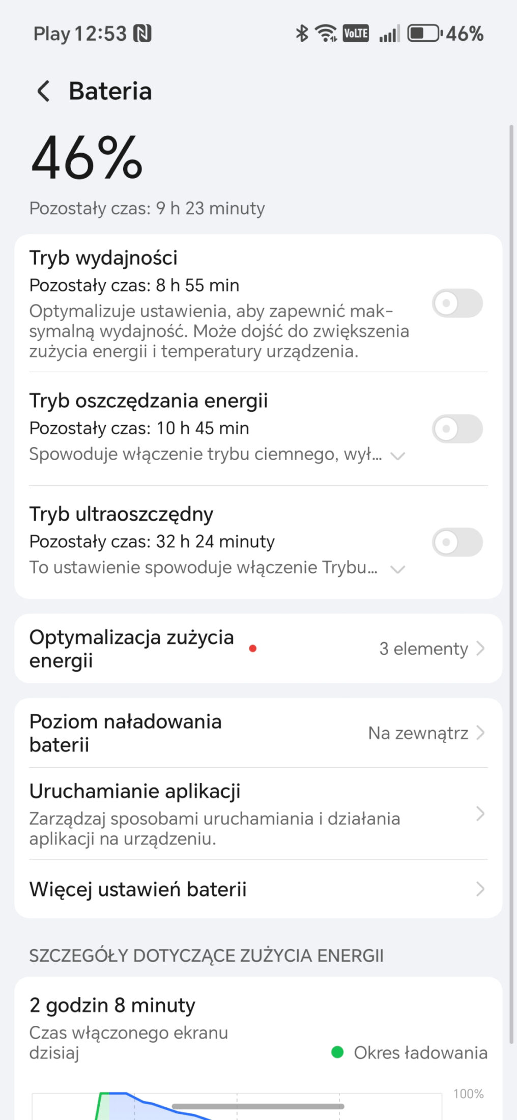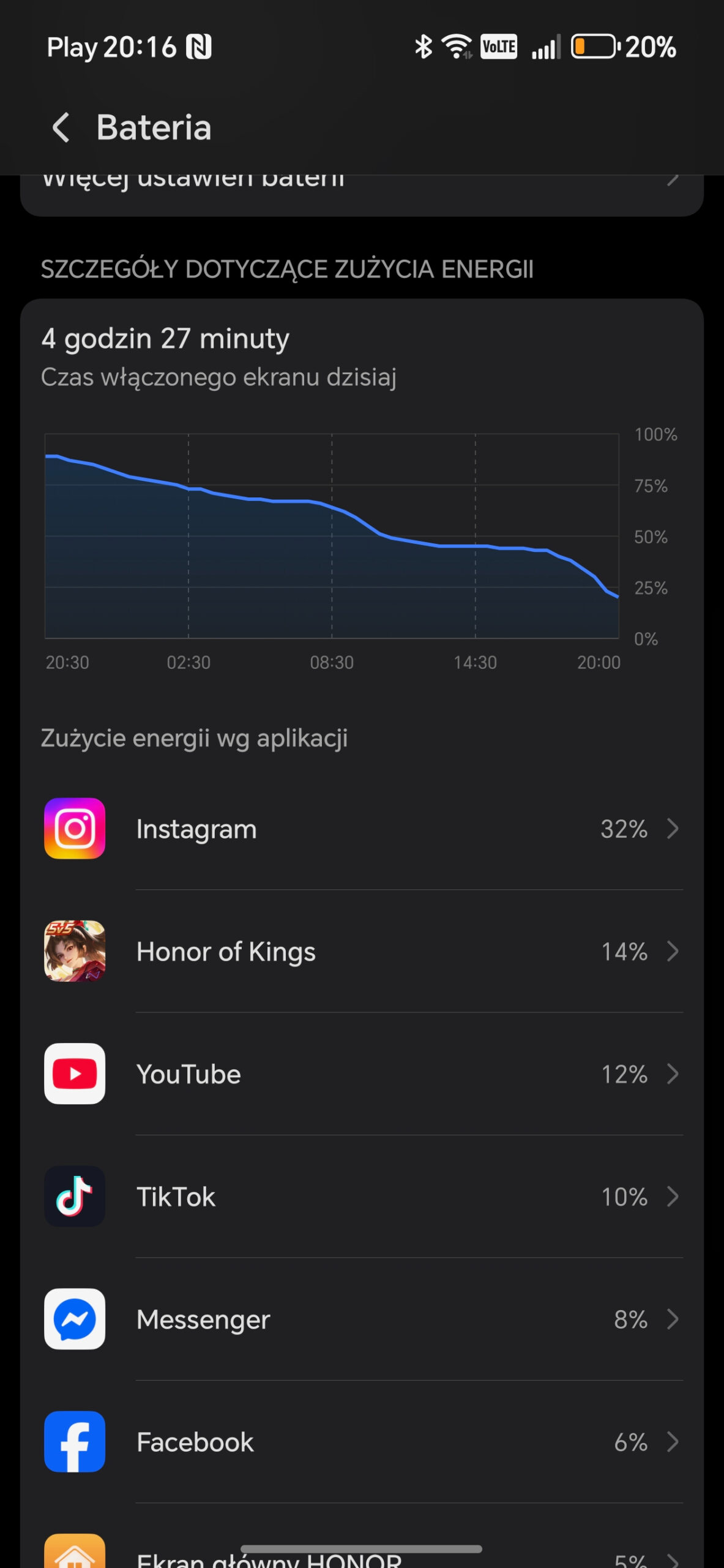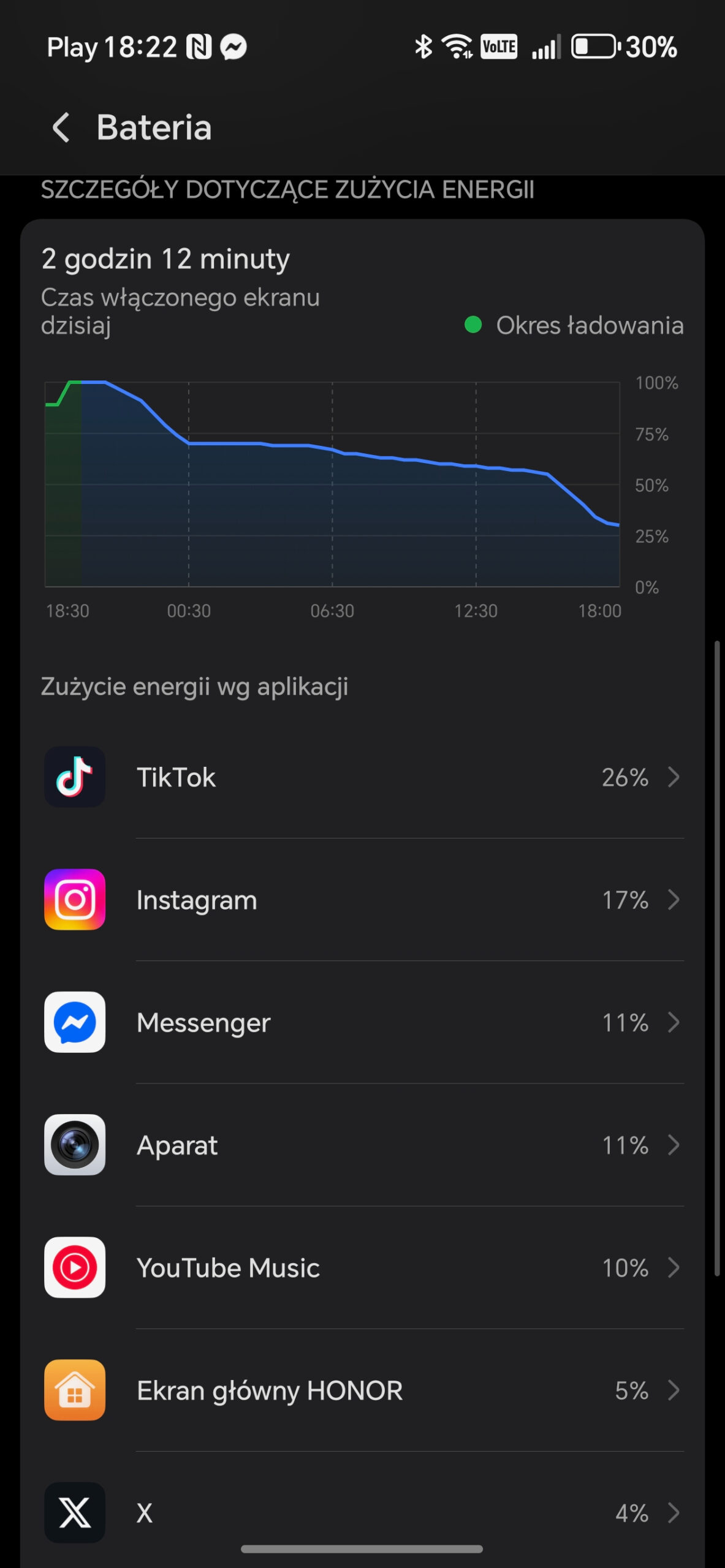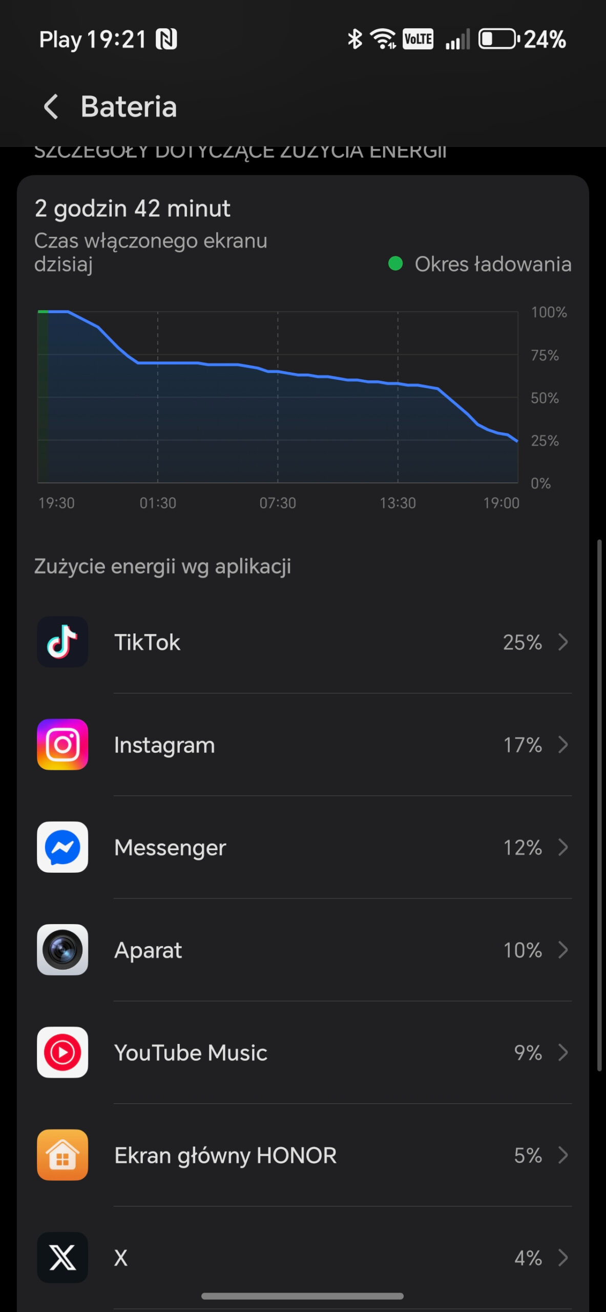 Telefon korzysta z krzemowo-węglowej baterii o pojemności 5300 mAh. Wspiera ono przewodowe ładowanie 66W HONOR Wired SuperCharge, więc można ją naładować do pełna w mniej niż godzinę. Producent zapewnia, że po czterech latach używania zachowa ponad 80% pierwotnej pojemności. Więcej o tym powiedzą zapewne użytkownicy, którzy właśnie tyle czasu będą korzystać z urządzenia. Co ważne, by móc cieszyć się szybkim ładowaniem, potrzebujemy odpowiednio mocne kostki. Bez tego czas ładowania wydłuża się znacząco do niemal dwóch godzin.
