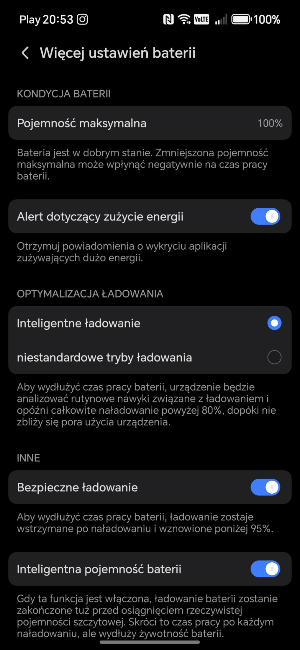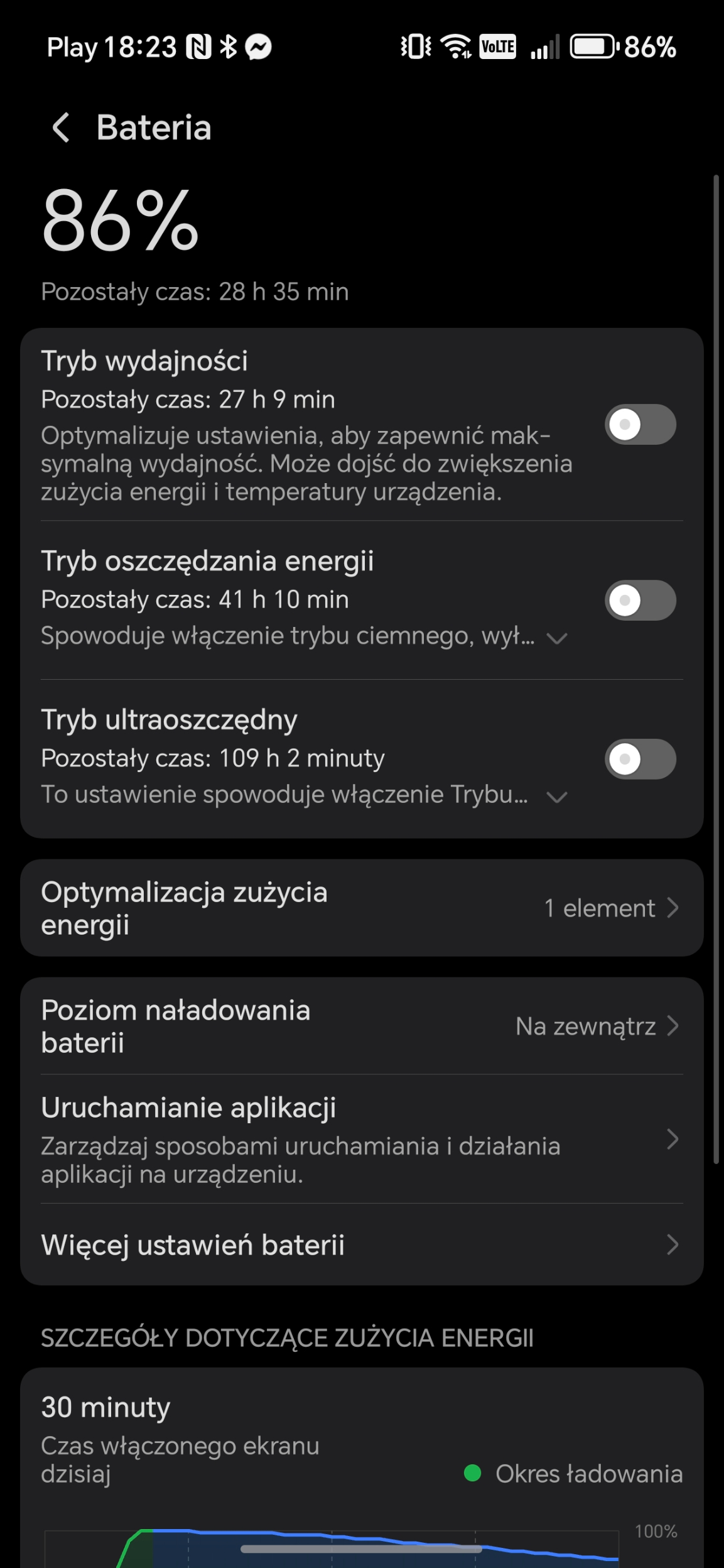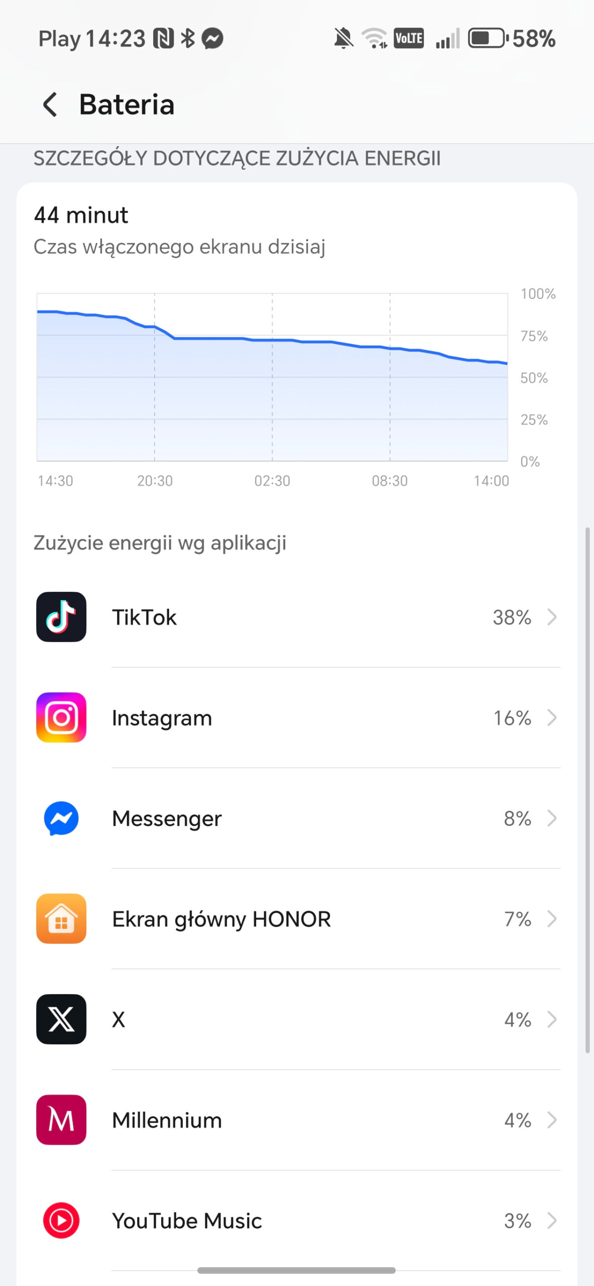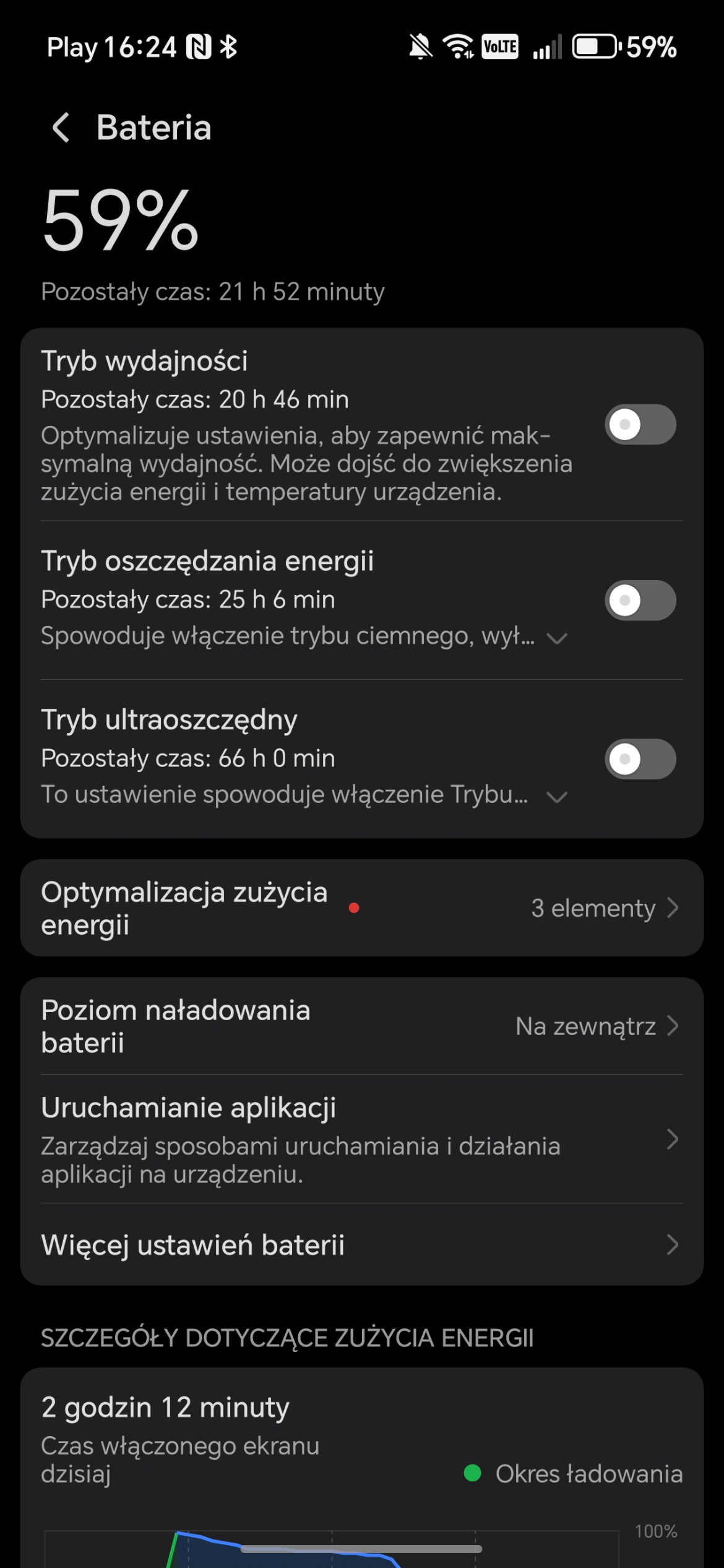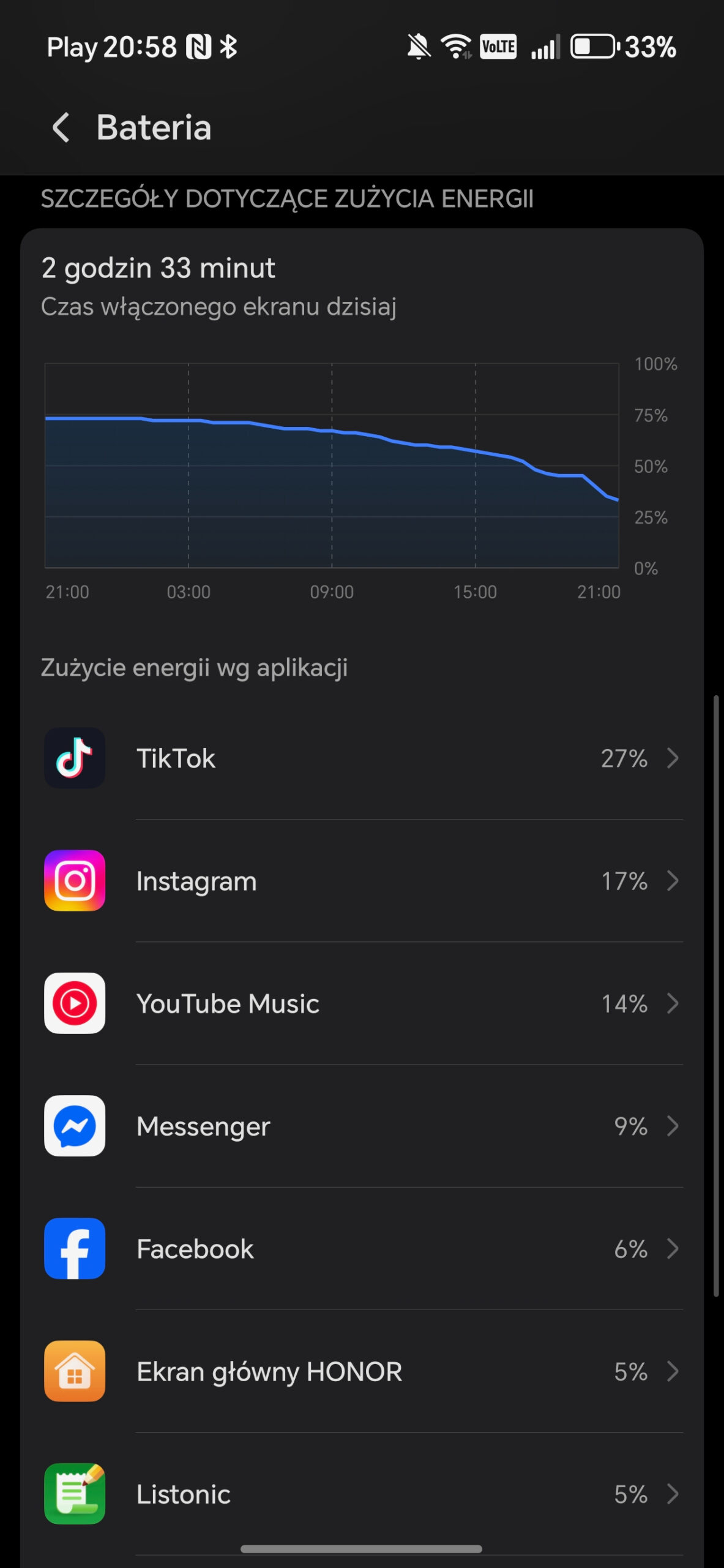 Telefon korzysta z krzemowo-węglowej baterii o pojemności 5300 mAh. Wspiera ono przewodowe ładowanie 66W HONOR Wired SuperCharge, więc można ją naładować do pełna w mniej niż godzinę. Producent zapewnia, że po czterech latach używania zachowa ponad 80% pierwotnej pojemności. Więcej o tym powiedzą zapewne użytkownicy, którzy właśnie tyle czasu będą korzystać z urządzenia. Co ważne, by móc cieszyć się szybkim ładowaniem, potrzebujemy odpowiednio mocne kostki. Bez tego czas ładowania wydłuża się znacząco do niemal dwóch godzin.