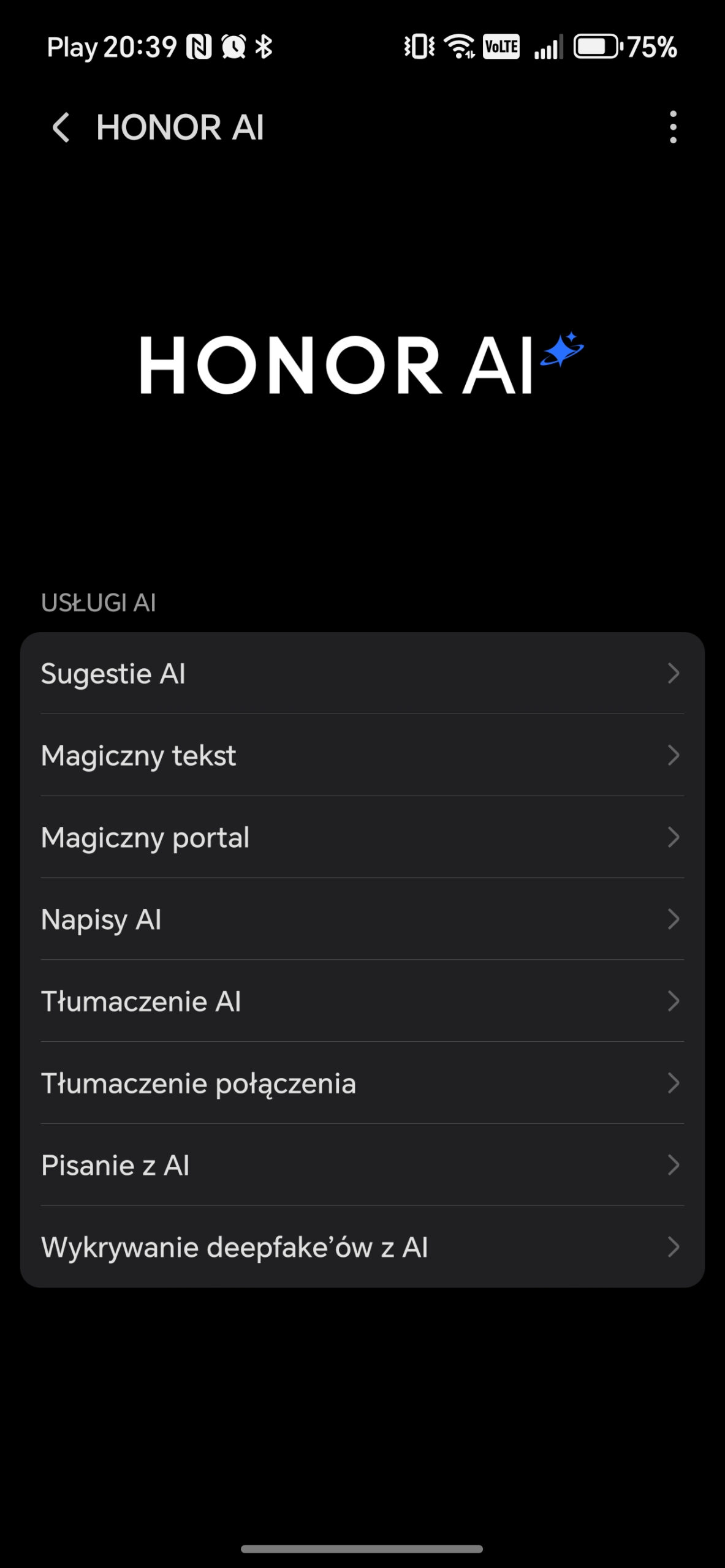Dzięki sztucznej inteligencji aparat 200 Mpx w tym egzemplarzu potrafi robić ostre zdjęcia, a AI wspiera edycję obrazów przez narzędzia takie jak Gumka AI oraz AI Super Zoom. Ponadto producent wprowadza funkcję AI Image to Video, stworzoną we współpracy z Google Cloud, która zmienia statyczne zdjęcia w krótkie, pięciosekundowe wideo, działając lokalnie na urządzeniu. System MagicOS 9.0 napędza cały ekosystem AI: oferuje tłumaczenia (AI Translation), transkrypcje dźwięku (AI Recorder), automatyczne streszczanie notatek (AI Summary), podpowiedzi pisania (AI Writing Tools) oraz napisy (AI Subtitles). HONOR zadbał również o bezpieczeństwo. Smartfon dostaje funkcję wykrywania deepfake’ów bazującą na sztucznej inteligencji, dzięki czemu chroni użytkowników przed fałszywymi treściami generowanymi przez AI. Nie brakuje Asystenta AI Google Gemini oraz Magicznego Portalu.