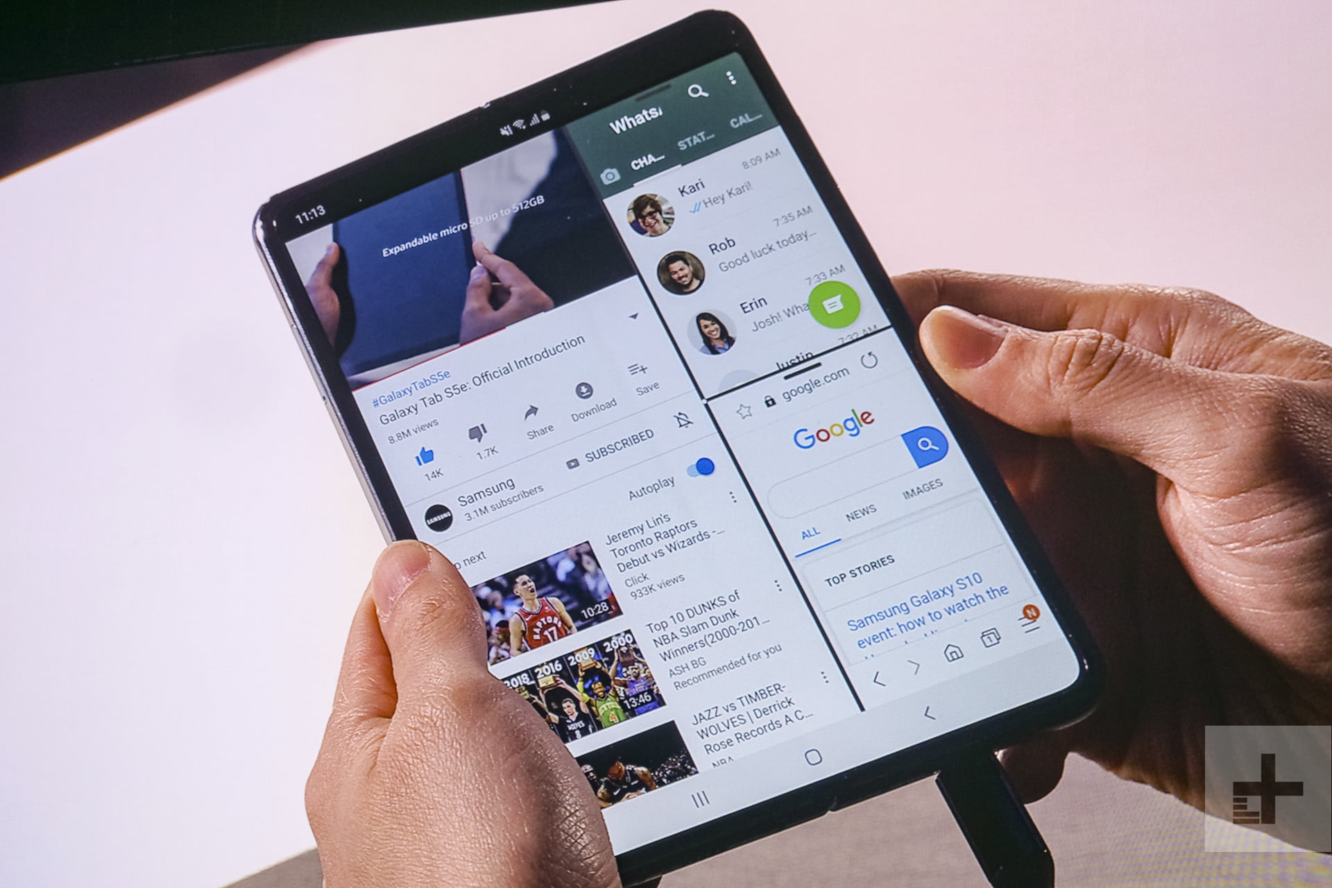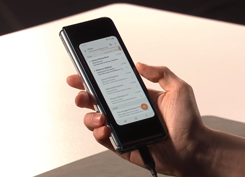 Już nie tylko FlexPai jest ich przedstawicielem. Samsung nie chciał pozostać z tyłu i zaprezentował Galaxy Fold, który zaskoczył dwoma różnymi ekranami znajdującymi się z dwóch stron. Główny ekran to 7,3” Dynamic AMOLED. Po złożeniu urządzenia można korzystać z drugiego wyświetlacza Super AMOLED o wielkości 4,6″. Oba ekrany spójnie ze sobą współpracują, więc wszystko, co wykonamy na mniejszym ekranie, przeniesie się na duży zaraz po rozłożeniu.