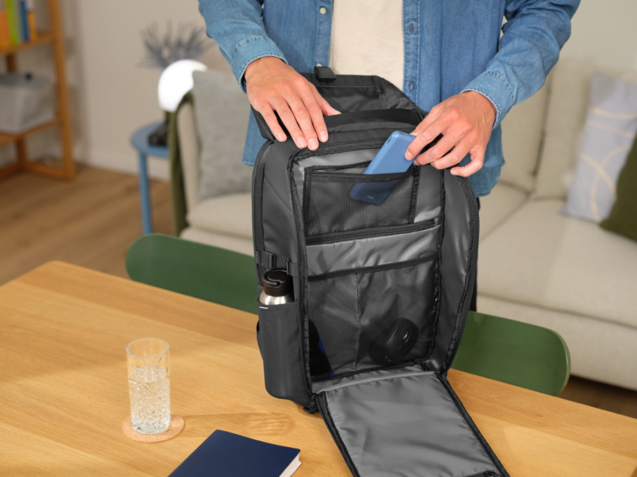 Pojemność 25 litrów ułatwia pakowanie, a solidna konstrukcja dobrze znosi intensywne użytkowanie. Wodoodporna tkanina z powłoką PU o klasie IPX4 chroni zawartość przed wilgocią, a uszczelnione zamki i osłonięta górna część dodatkowo zwiększają bezpieczeństwo. Wzmocniona komora mieści laptopa do 17 cali, natomiast odporna na wstrząsy budowa stabilizuje sprzęt w trakcie przemieszczania.