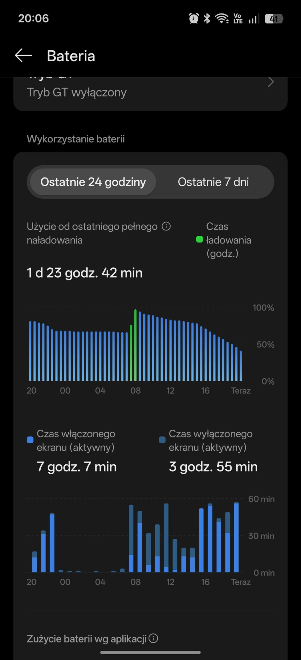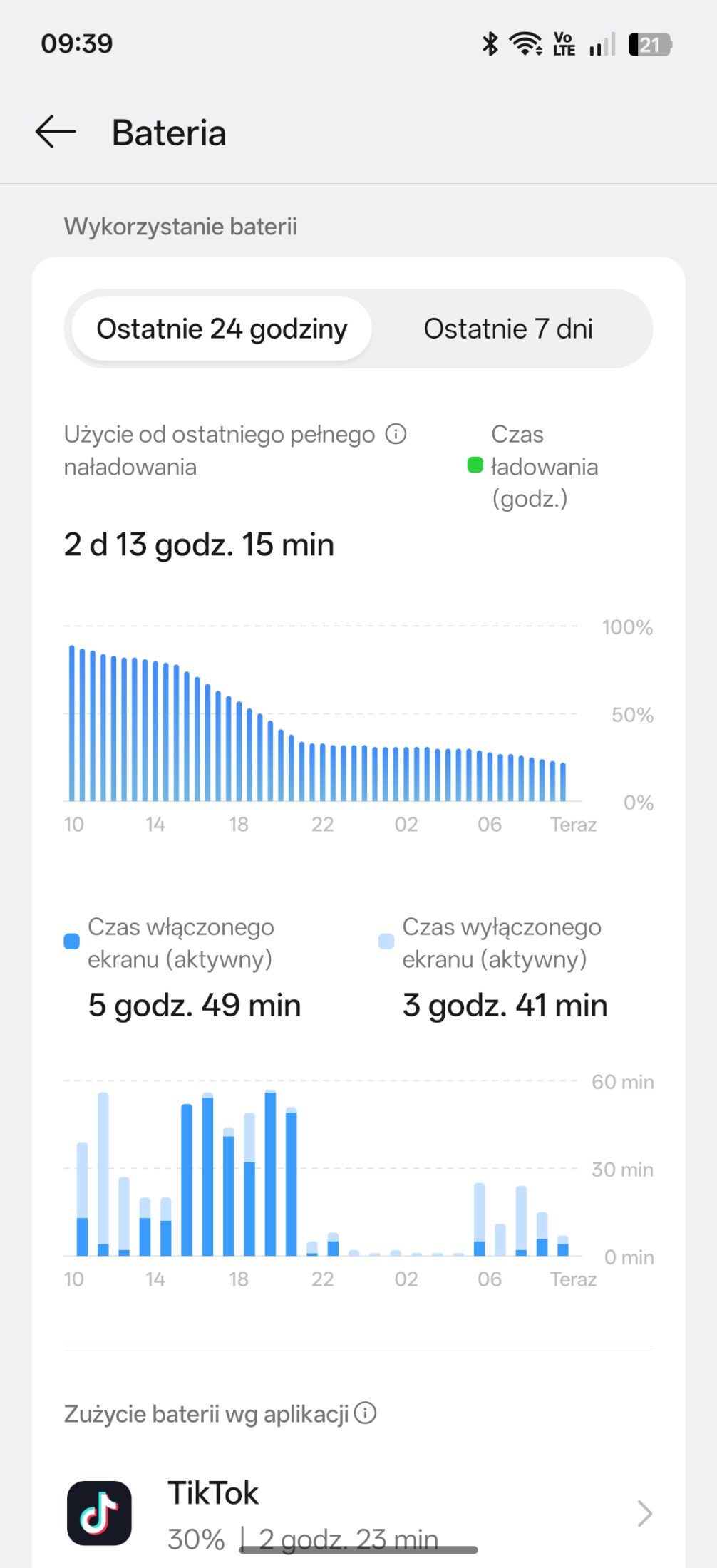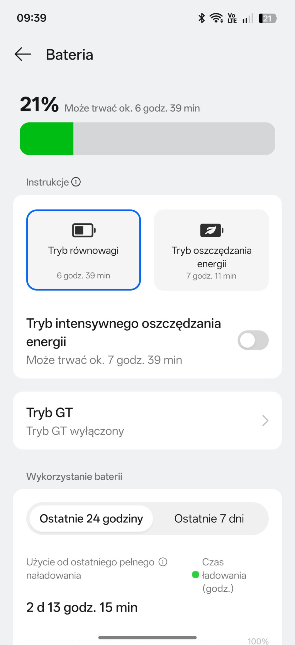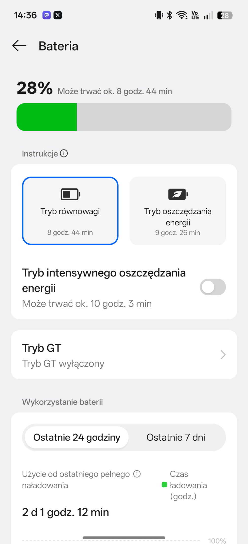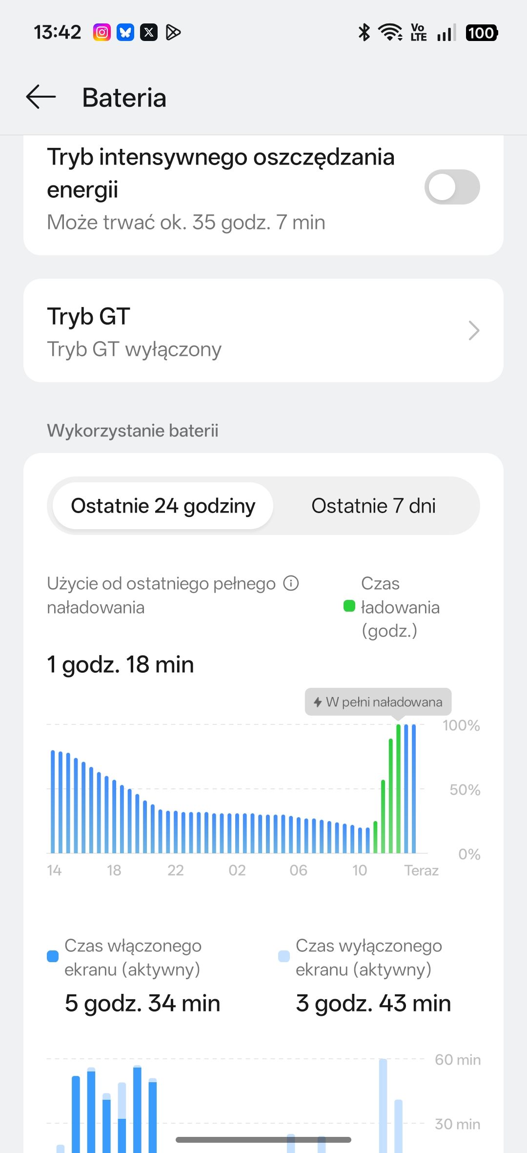 Mocną stroną urządzenia zdecydowanie jest bateria. realme 16 Pro+ wykorzystuje akumulator krzemowo-węglowy o pojemności 7000 mAh, a jednocześnie zachowuje przy tym naprawdę smukłą budowę. W praktyce urządzenie sprawdza się jako sprzęt na długie godziny pracy. Trudno rozładować go w ciągu jednego dnia nawet przy intensywnym użytkowaniu, więc zwykle kończyło się na dwóch do nawet dwóch i pół dnia na jednym ładowaniu. Przyznaję, że czasami po prostu nie miałam ochoty siedzieć na telefonie, więc z pewnością i to miało wpływ na czas działania.