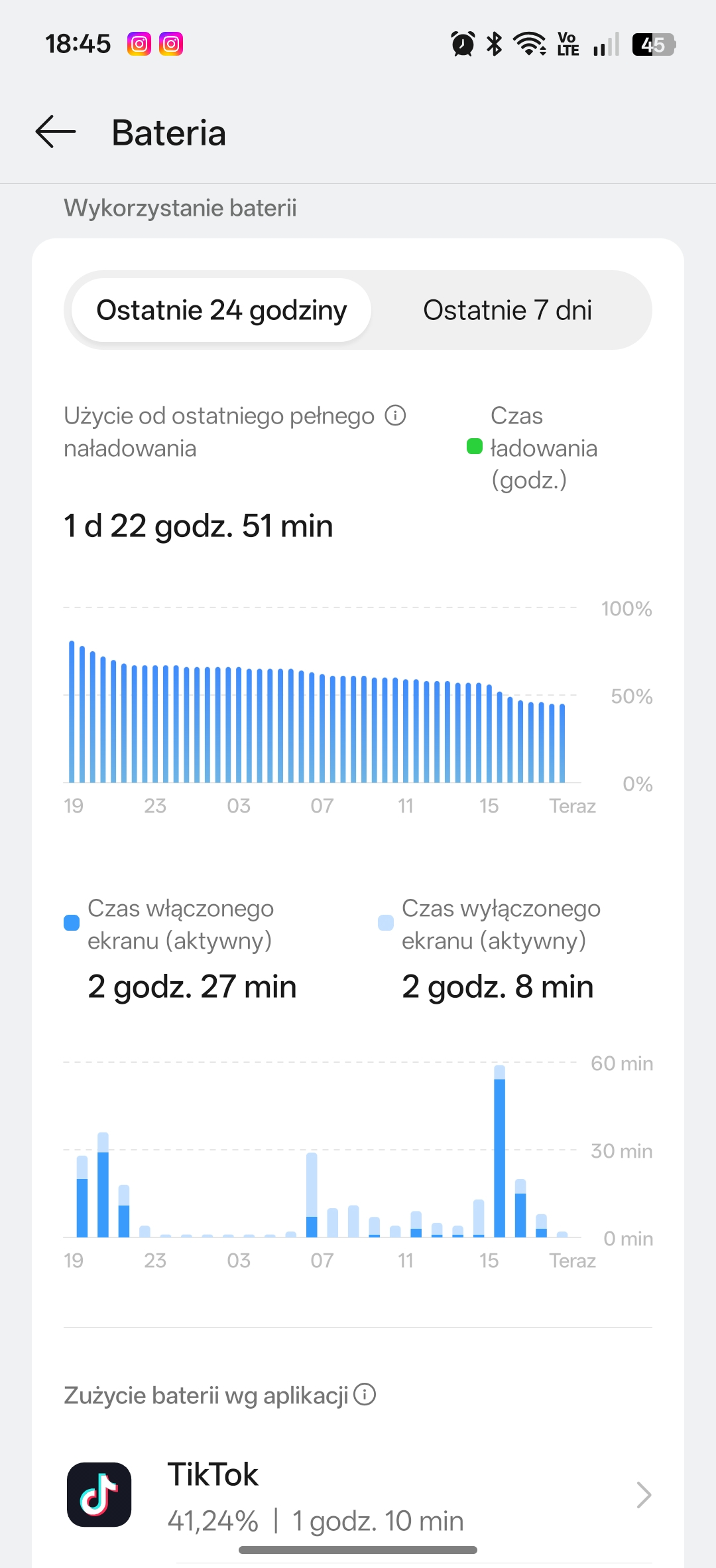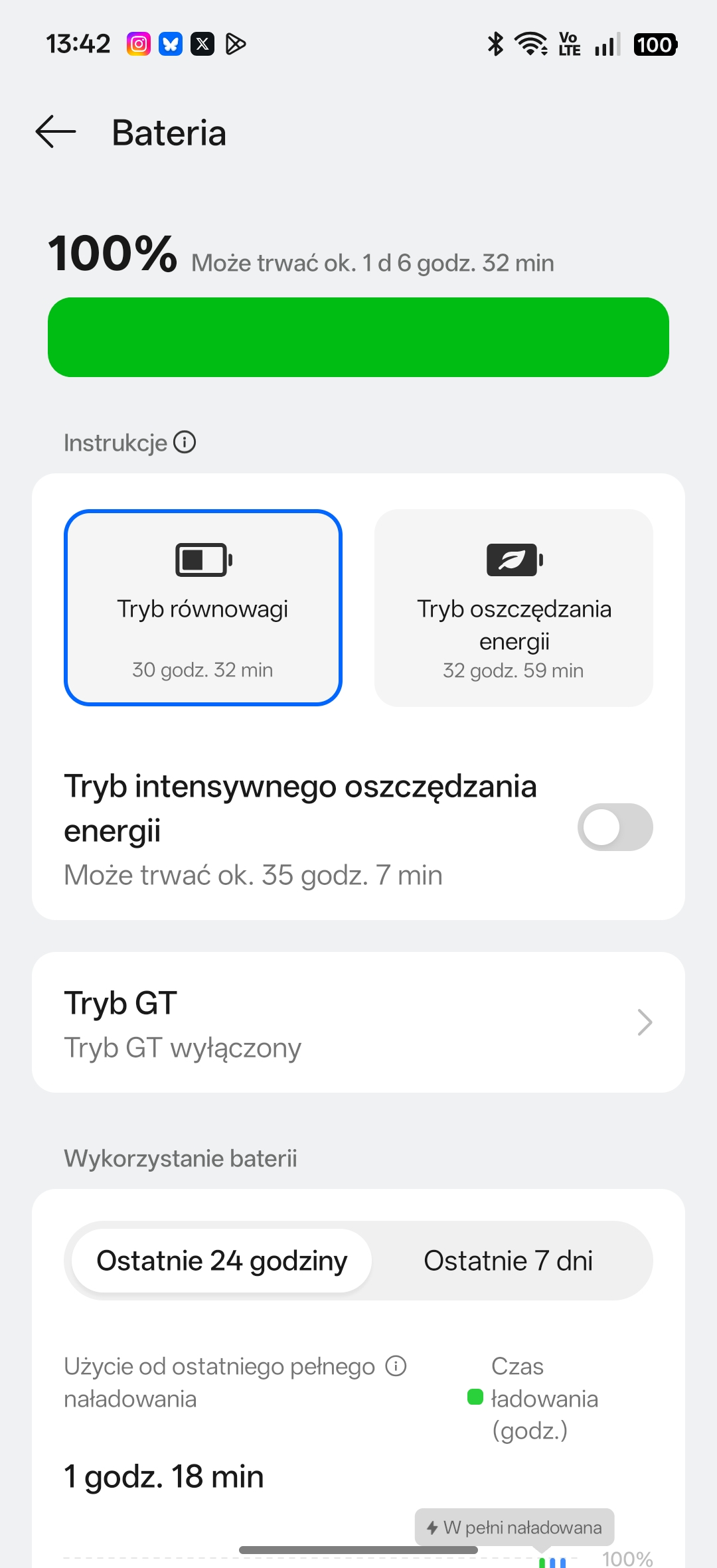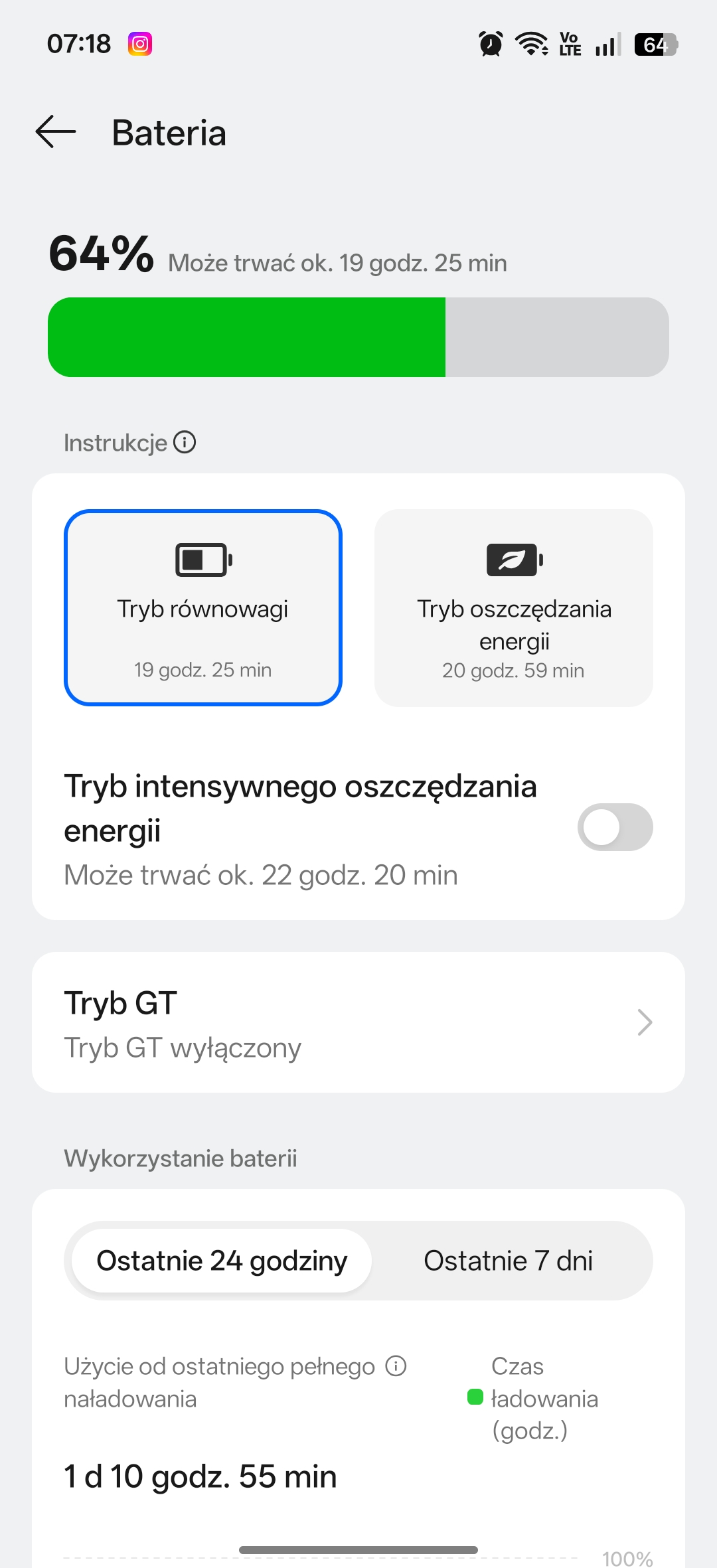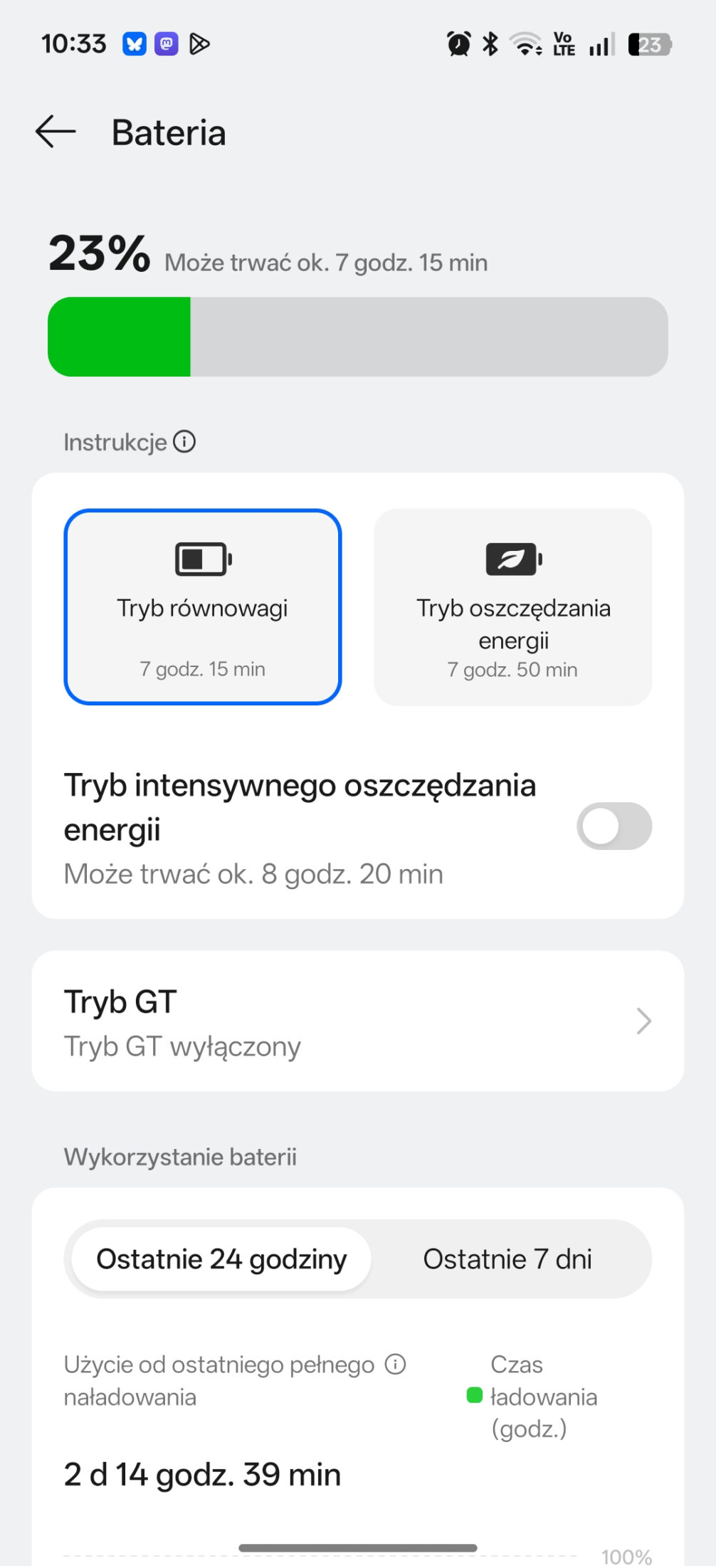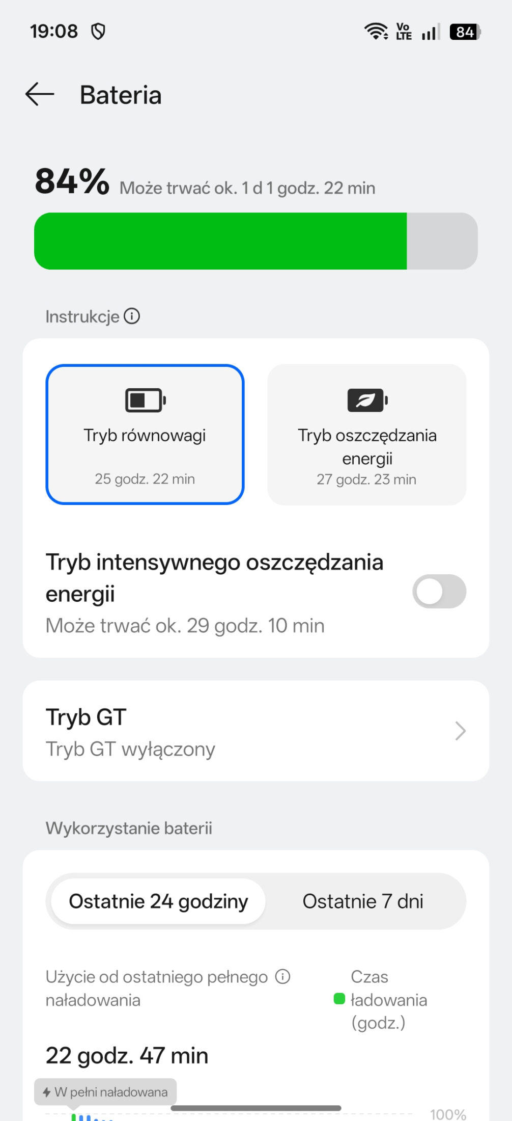 Mocną stroną urządzenia zdecydowanie jest bateria. realme 16 Pro+ wykorzystuje akumulator krzemowo-węglowy o pojemności 7000 mAh, a jednocześnie zachowuje przy tym naprawdę smukłą budowę. W praktyce urządzenie sprawdza się jako sprzęt na długie godziny pracy. Trudno rozładować go w ciągu jednego dnia nawet przy intensywnym użytkowaniu, więc zwykle kończyło się na dwóch do nawet dwóch i pół dnia na jednym ładowaniu. Przyznaję, że czasami po prostu nie miałam ochoty siedzieć na telefonie, więc z pewnością i to miało wpływ na czas działania.