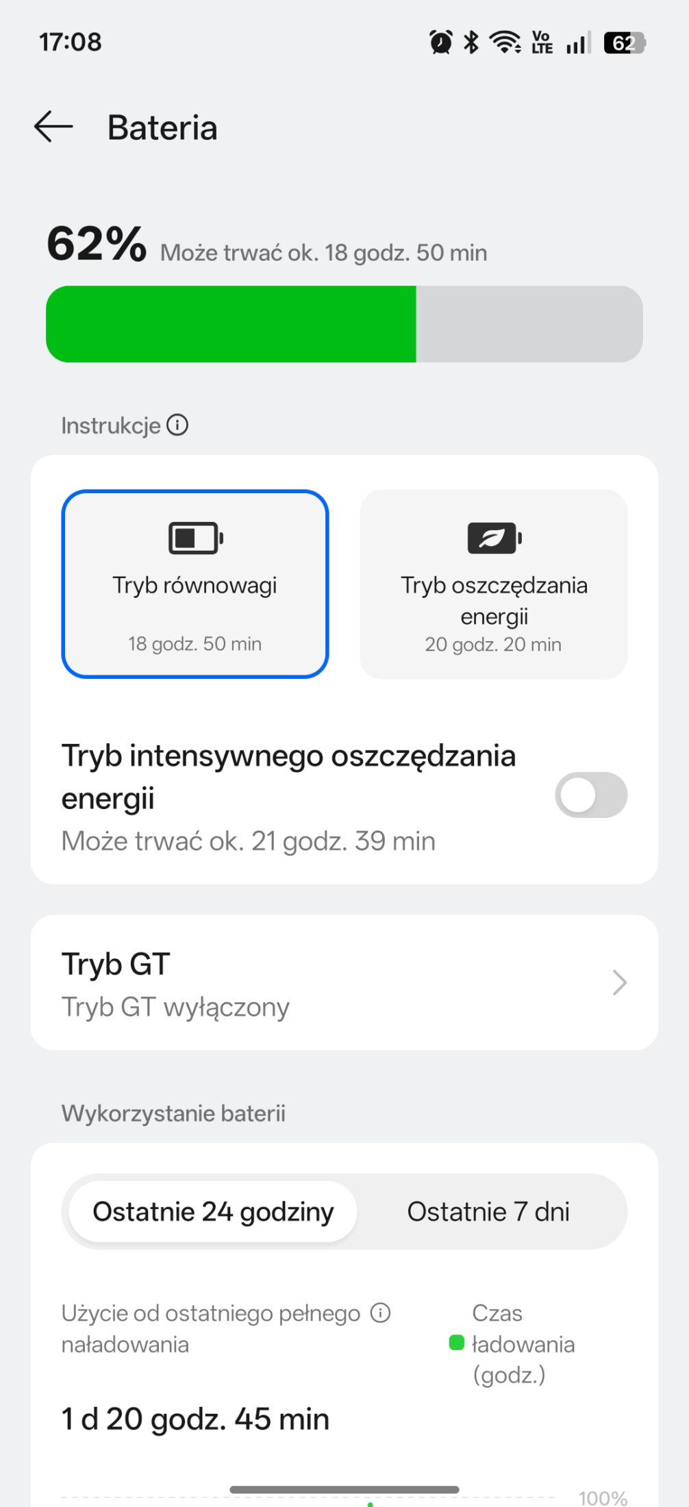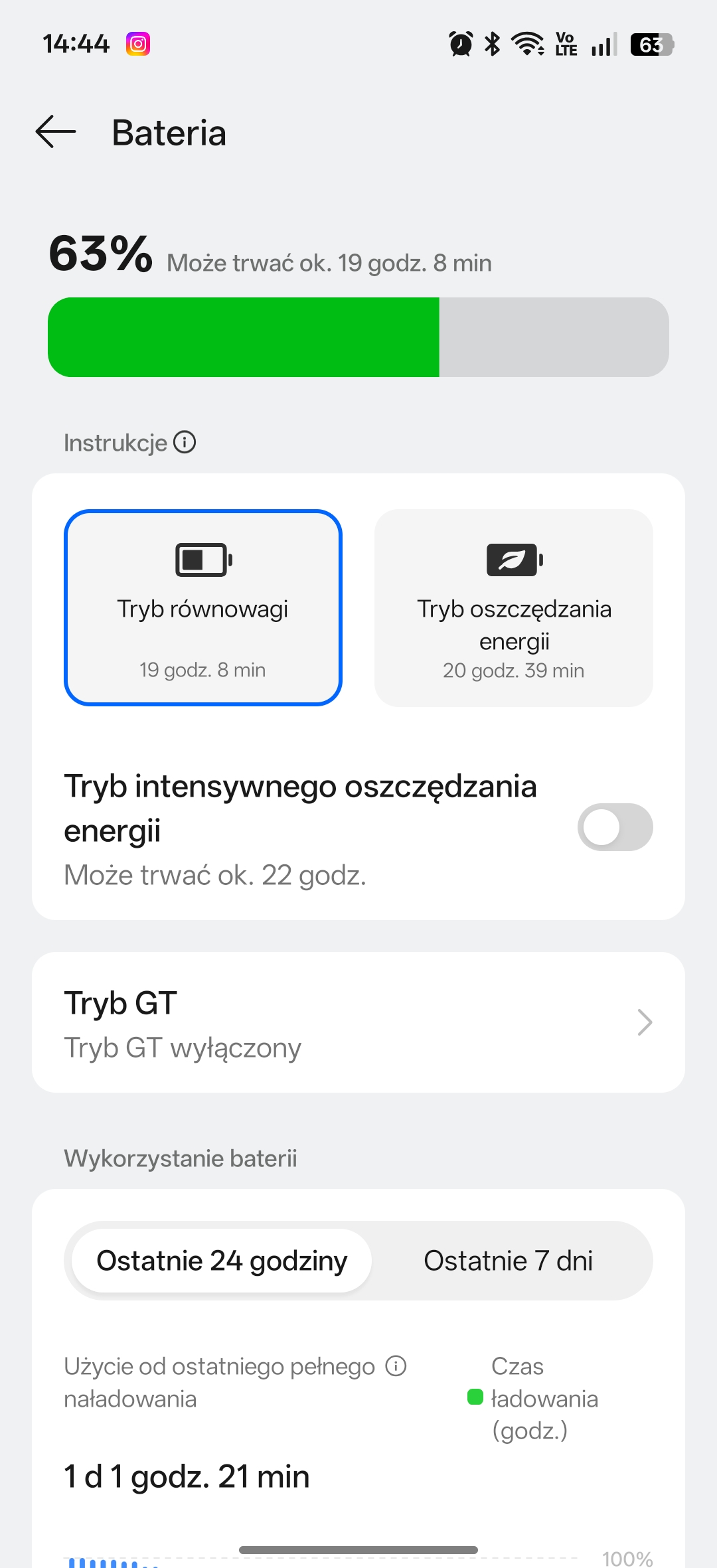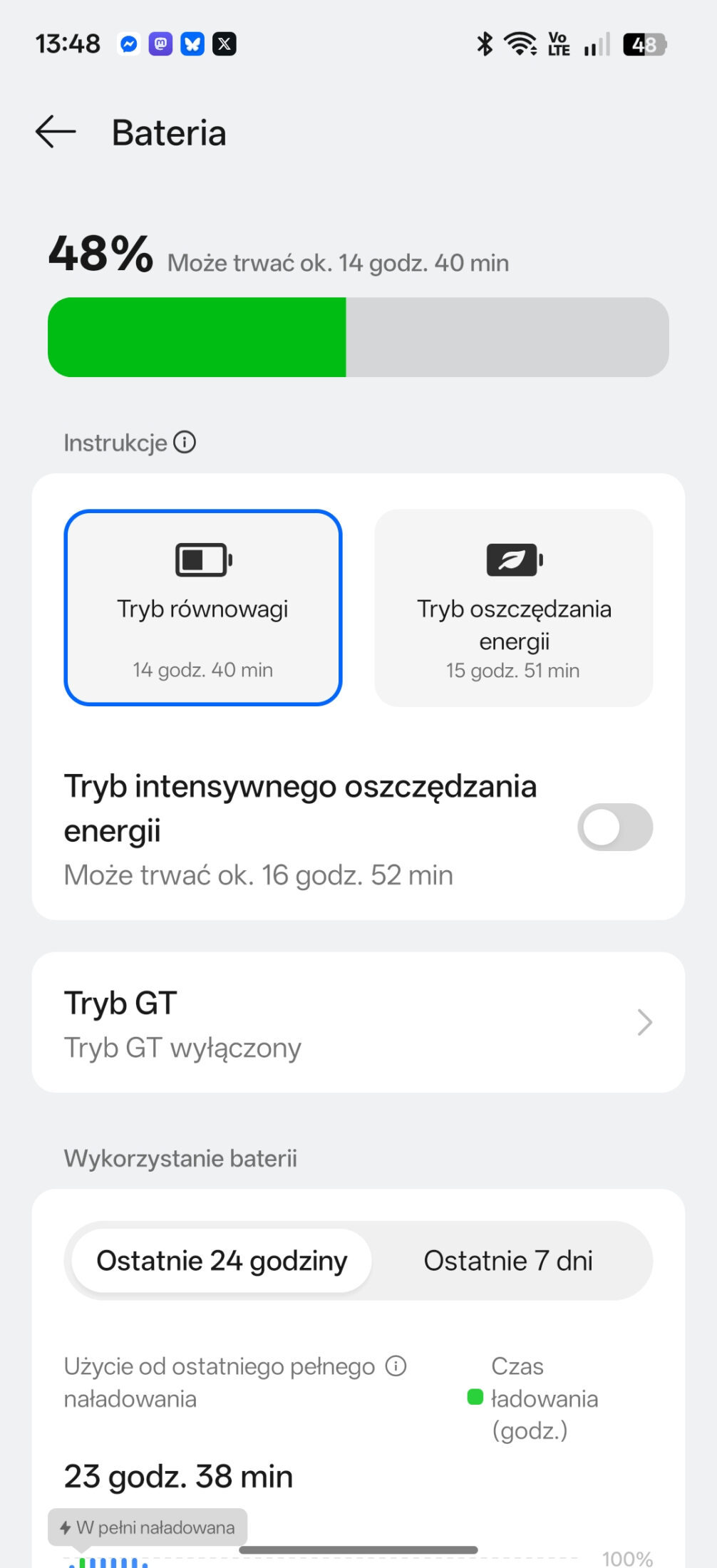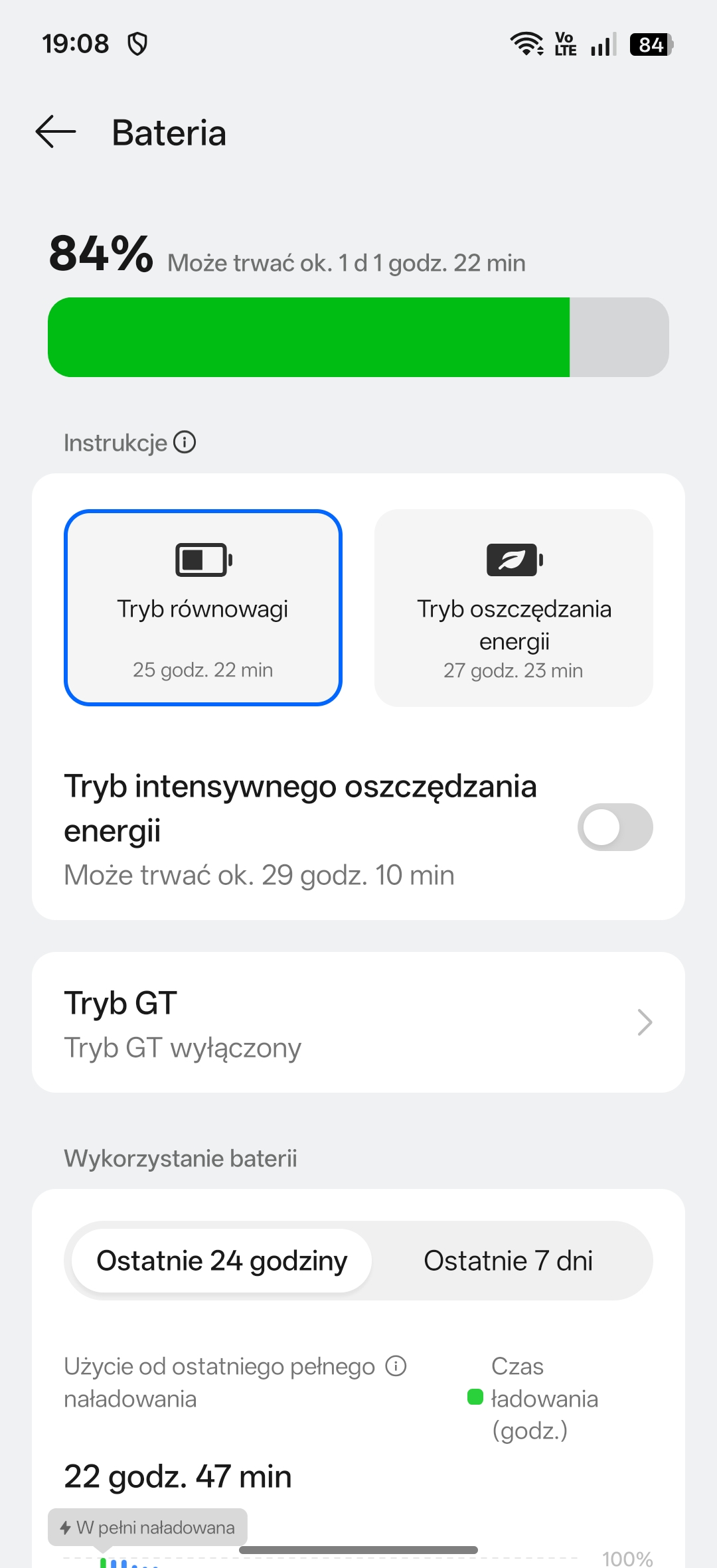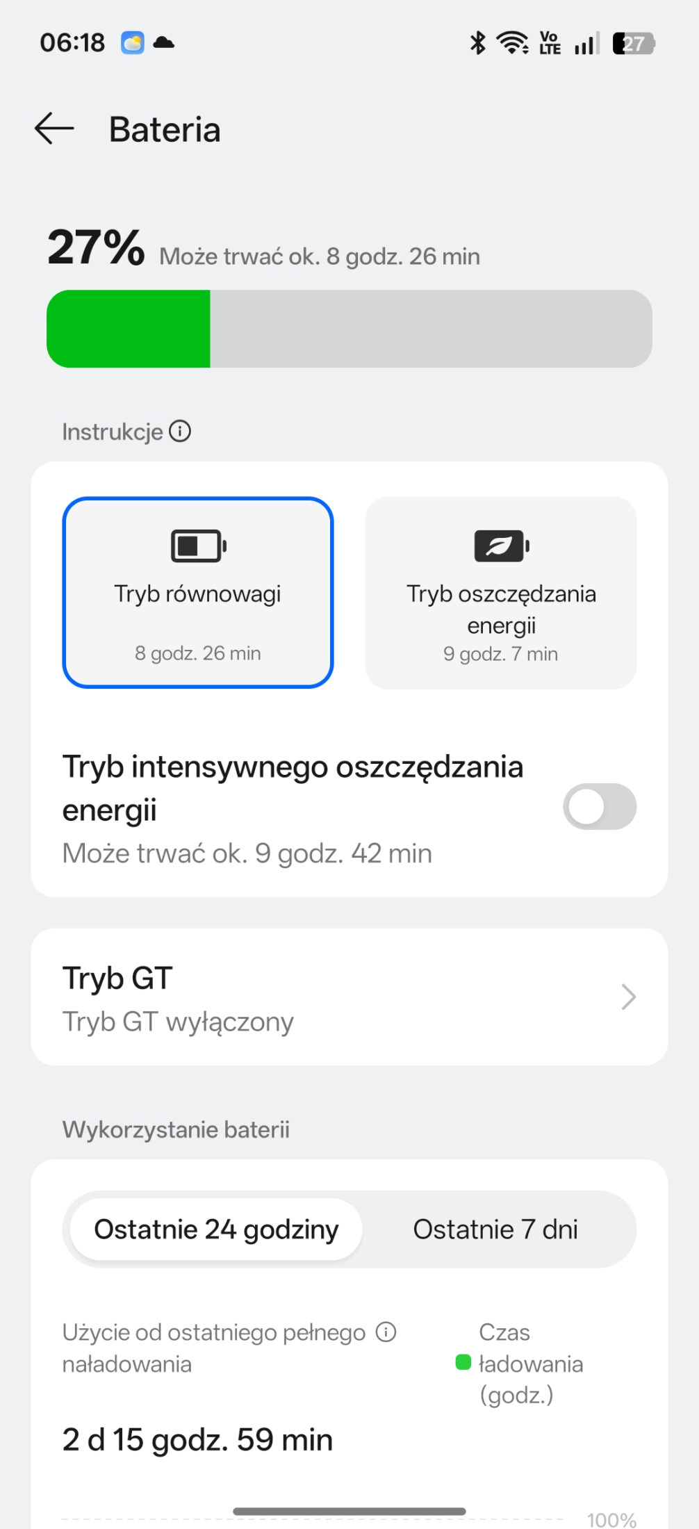 Mocną stroną urządzenia zdecydowanie jest bateria. realme 16 Pro+ wykorzystuje akumulator krzemowo-węglowy o pojemności 7000 mAh, a jednocześnie zachowuje przy tym naprawdę smukłą budowę. W praktyce urządzenie sprawdza się jako sprzęt na długie godziny pracy. Trudno rozładować go w ciągu jednego dnia nawet przy intensywnym użytkowaniu, więc zwykle kończyło się na dwóch do nawet dwóch i pół dnia na jednym ładowaniu. Przyznaję, że czasami po prostu nie miałam ochoty siedzieć na telefonie, więc z pewnością i to miało wpływ na czas działania.