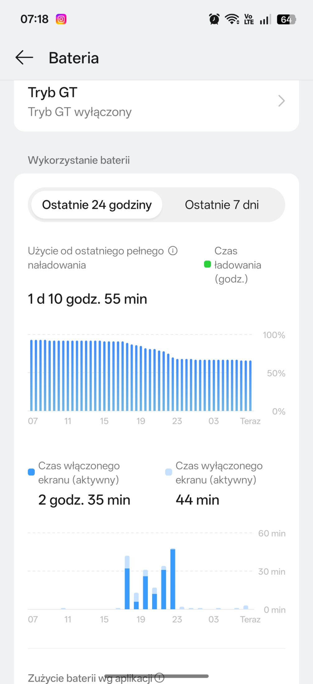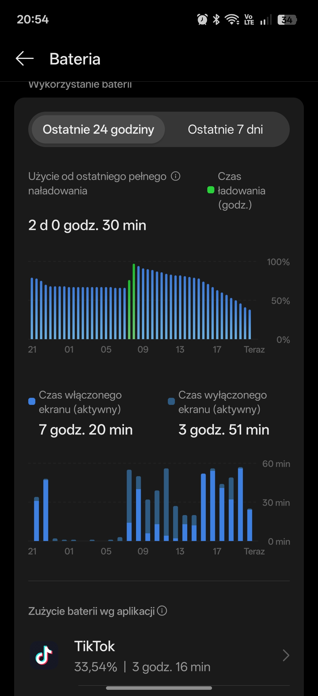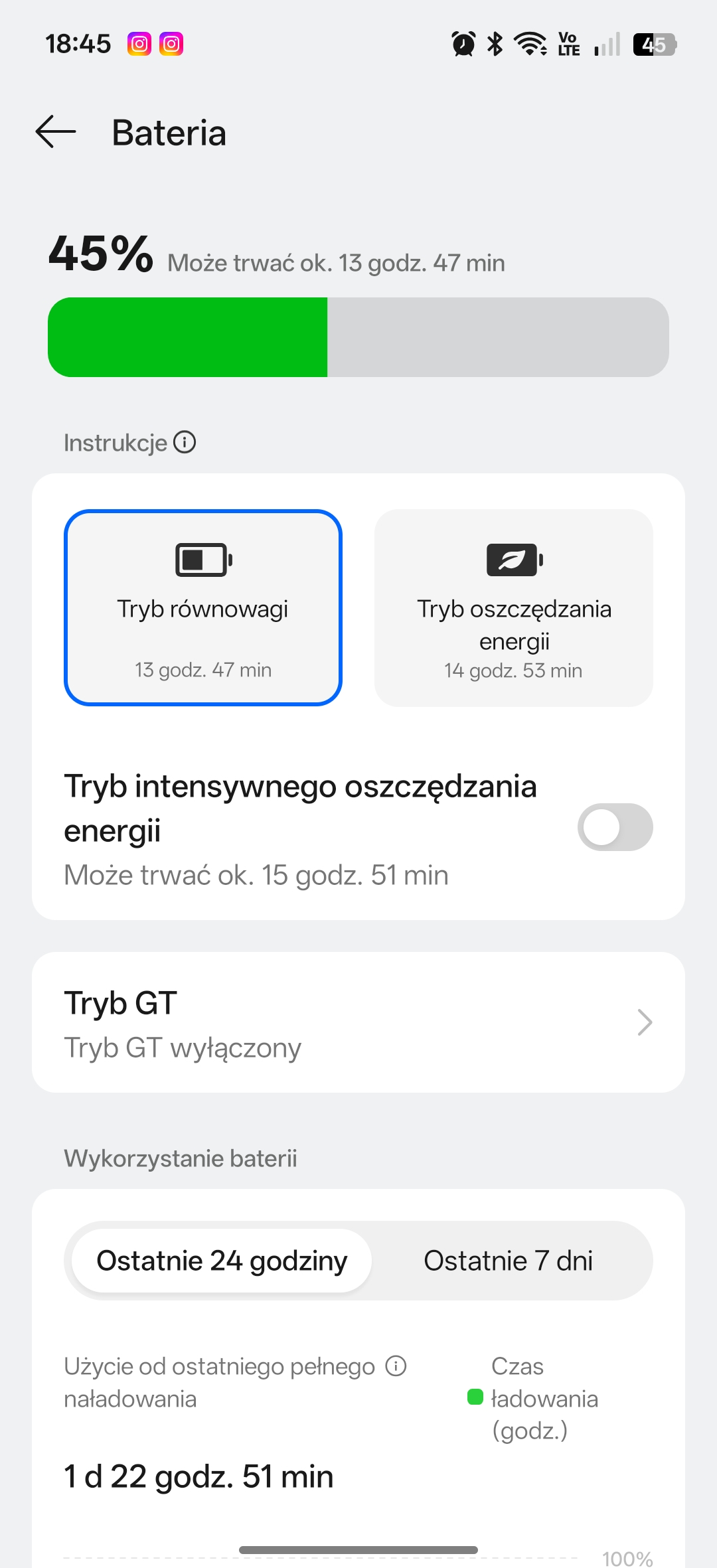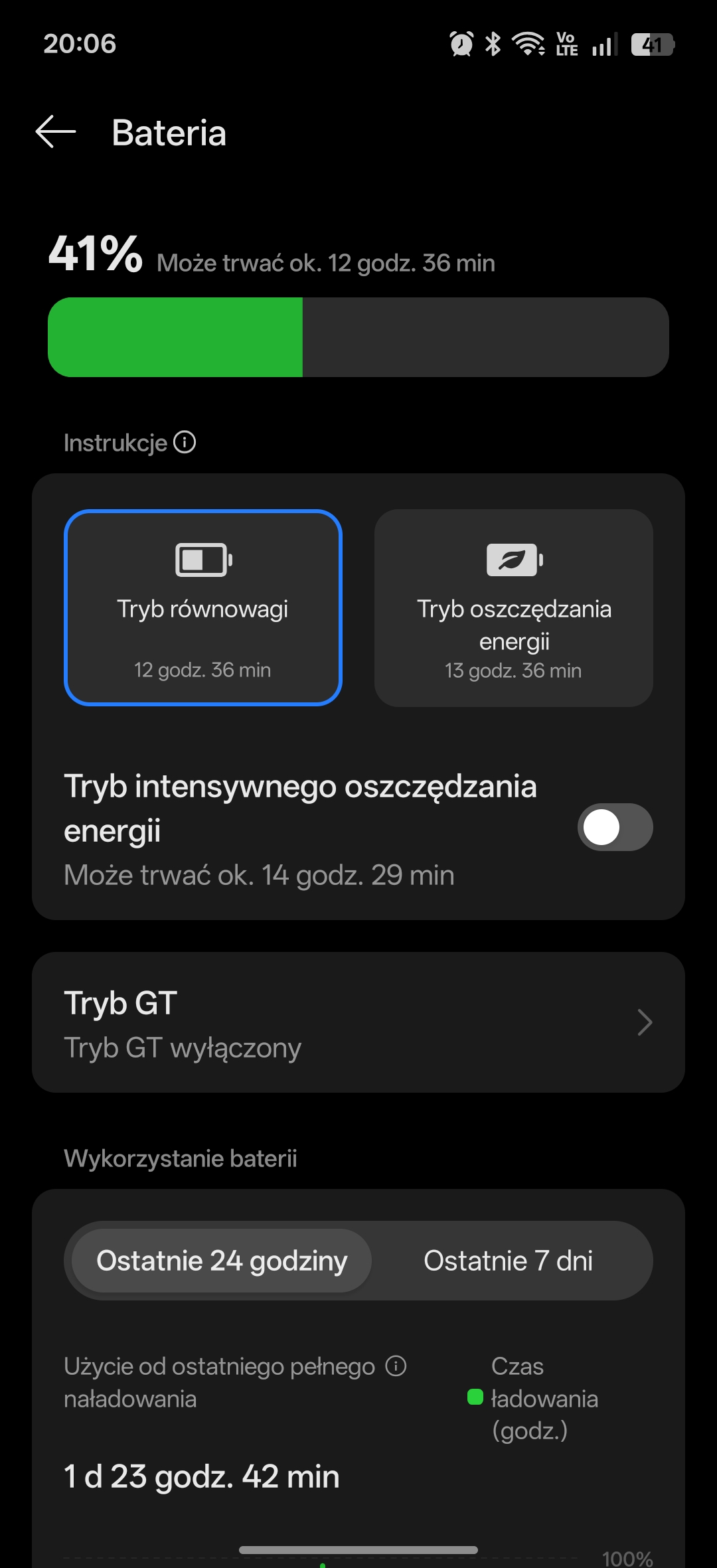 Mocną stroną urządzenia zdecydowanie jest bateria. realme 16 Pro+ wykorzystuje akumulator krzemowo-węglowy o pojemności 7000 mAh, a jednocześnie zachowuje przy tym naprawdę smukłą budowę. W praktyce urządzenie sprawdza się jako sprzęt na długie godziny pracy. Trudno rozładować go w ciągu jednego dnia nawet przy intensywnym użytkowaniu, więc zwykle kończyło się na dwóch do nawet dwóch i pół dnia na jednym ładowaniu. Przyznaję, że czasami po prostu nie miałam ochoty siedzieć na telefonie, więc z pewnością i to miało wpływ na czas działania.