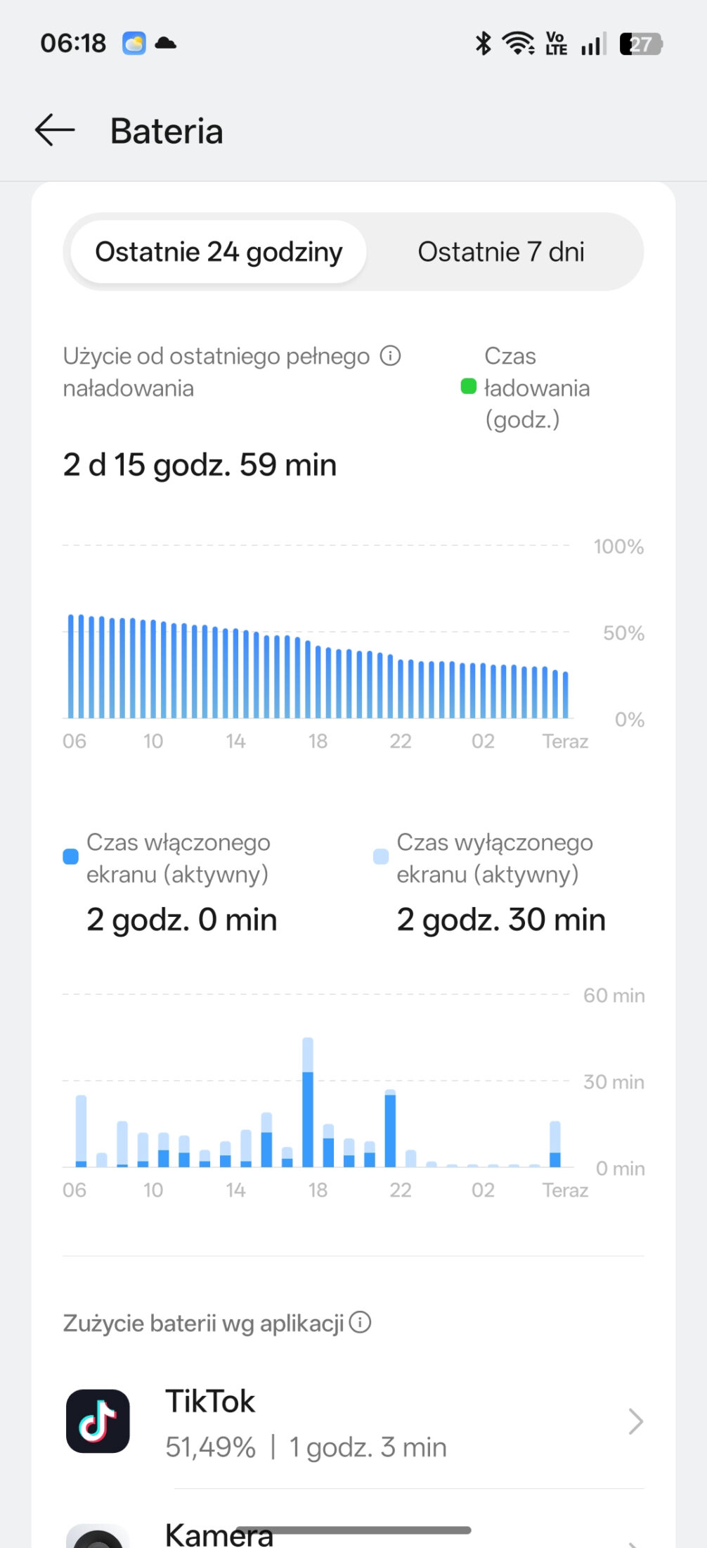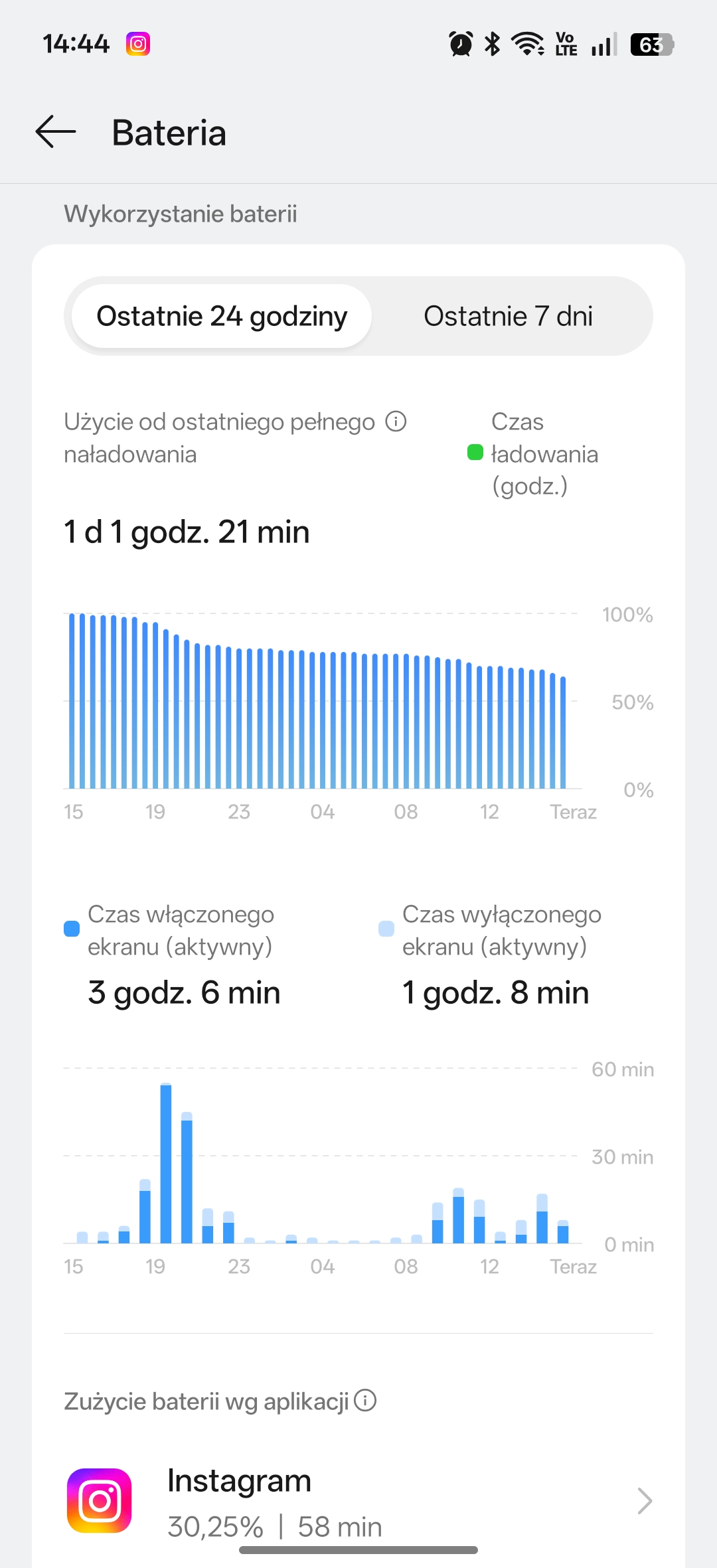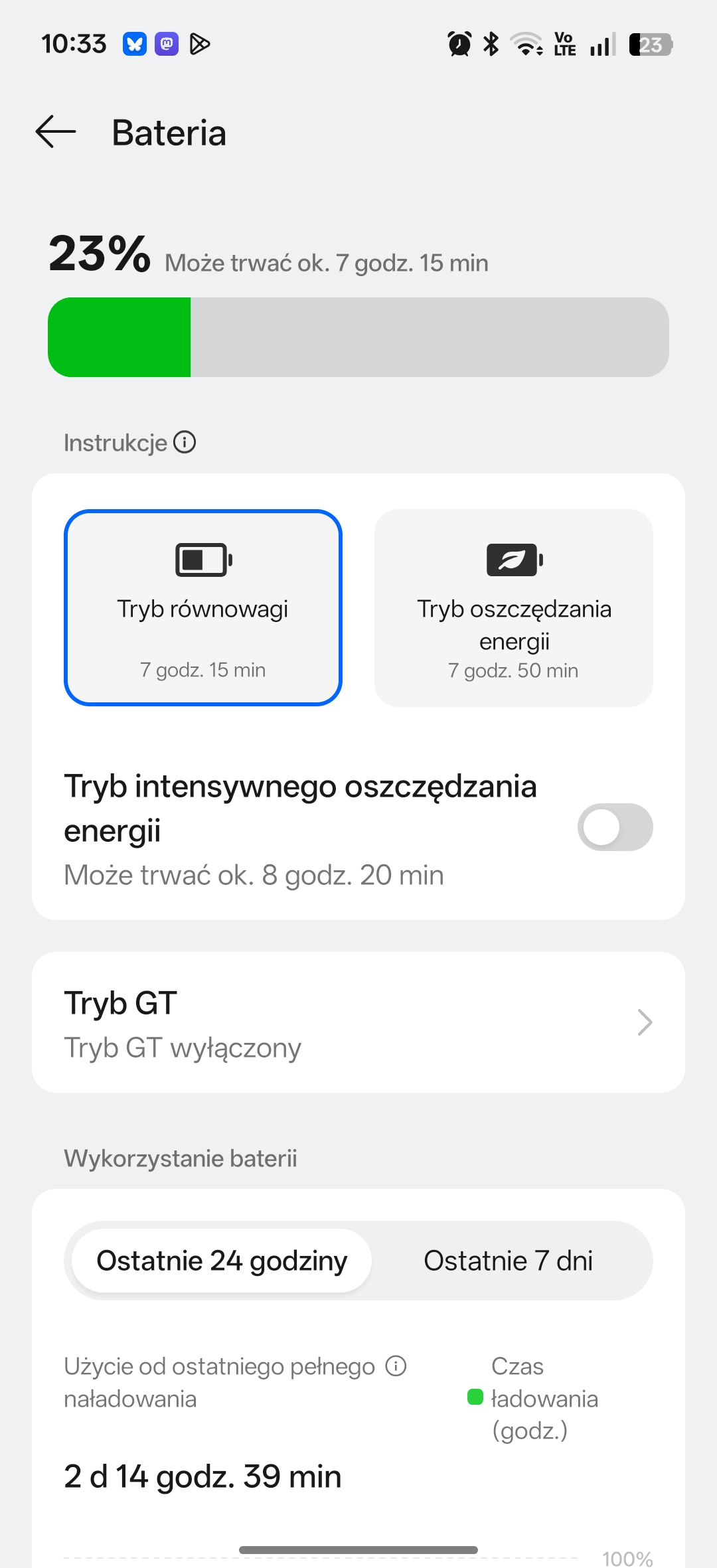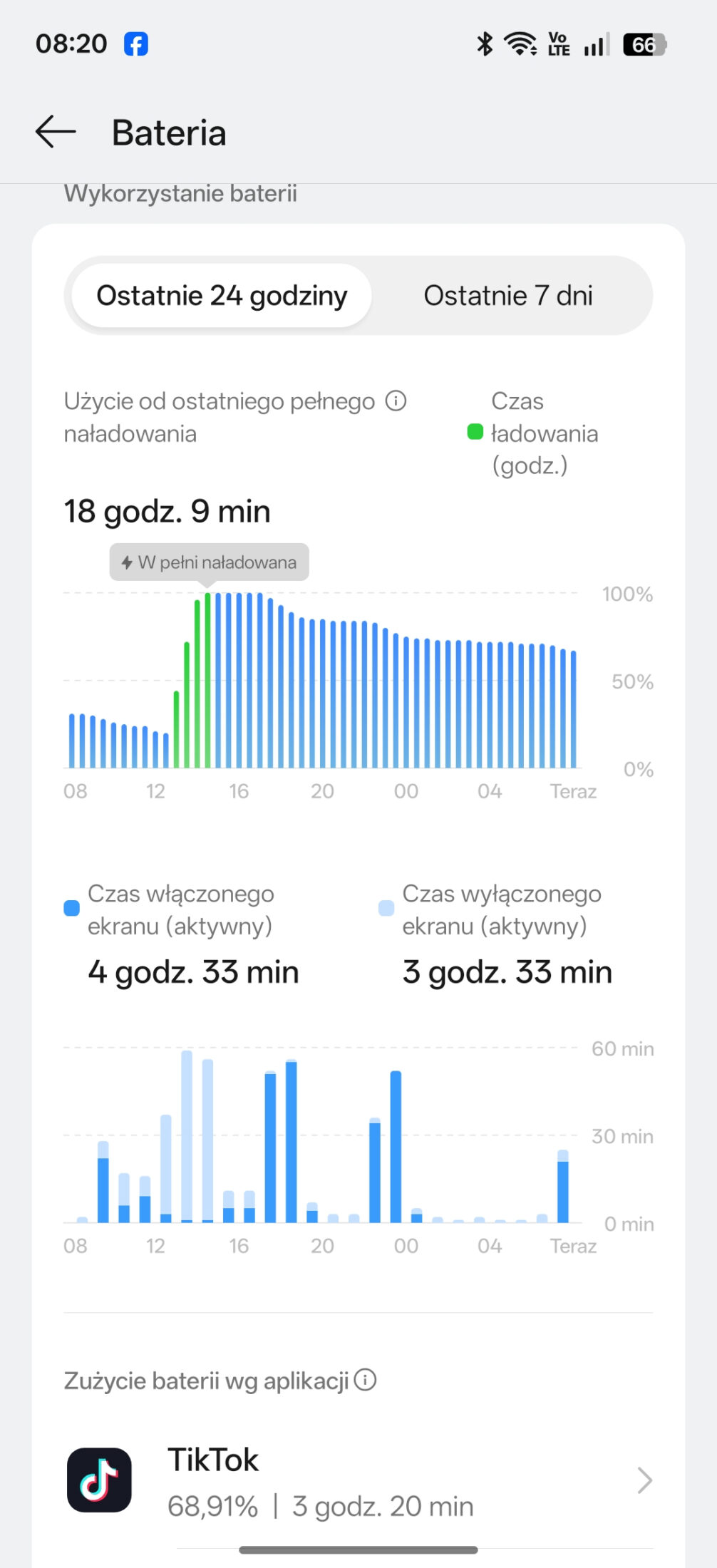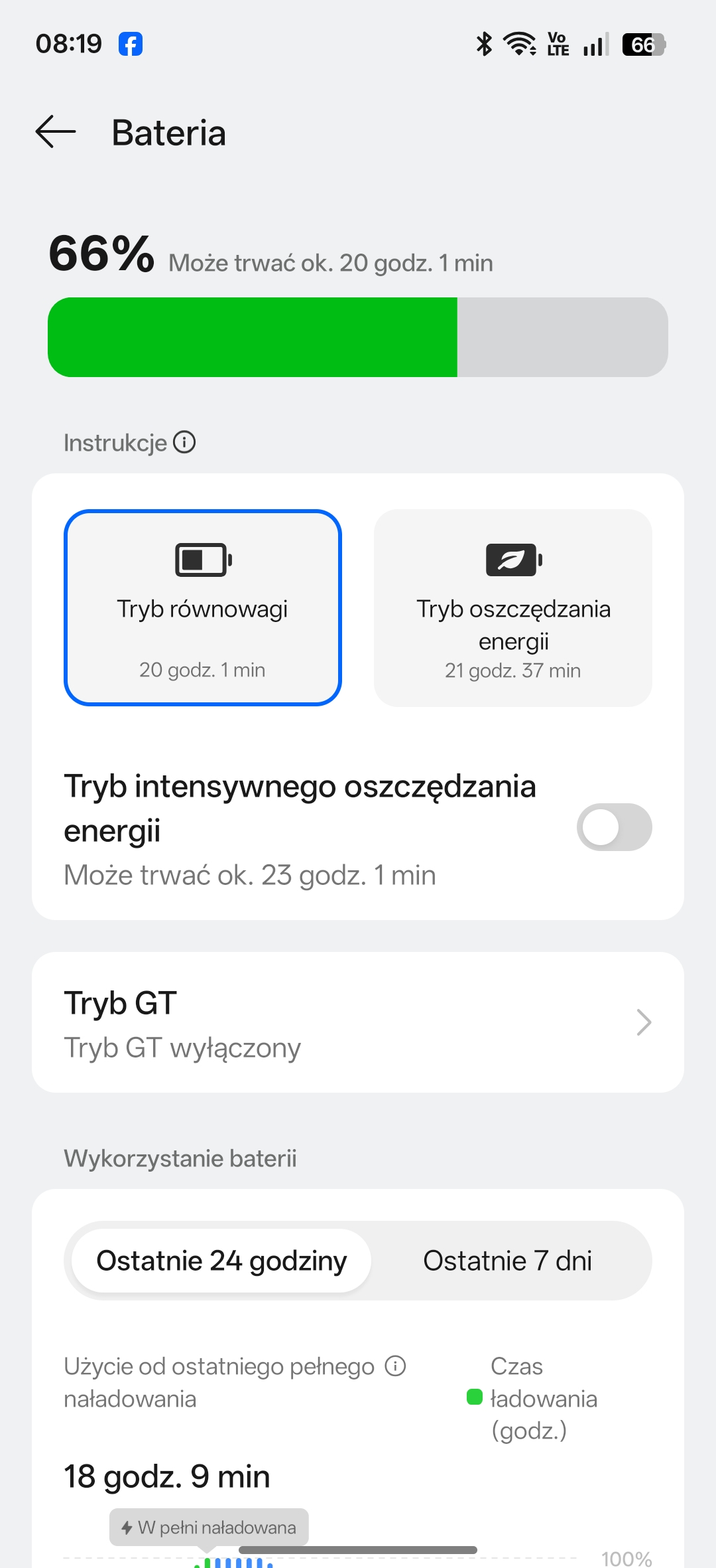 Mocną stroną urządzenia zdecydowanie jest bateria. realme 16 Pro+ wykorzystuje akumulator krzemowo-węglowy o pojemności 7000 mAh, a jednocześnie zachowuje przy tym naprawdę smukłą budowę. W praktyce urządzenie sprawdza się jako sprzęt na długie godziny pracy. Trudno rozładować go w ciągu jednego dnia nawet przy intensywnym użytkowaniu, więc zwykle kończyło się na dwóch do nawet dwóch i pół dnia na jednym ładowaniu. Przyznaję, że czasami po prostu nie miałam ochoty siedzieć na telefonie, więc z pewnością i to miało wpływ na czas działania.