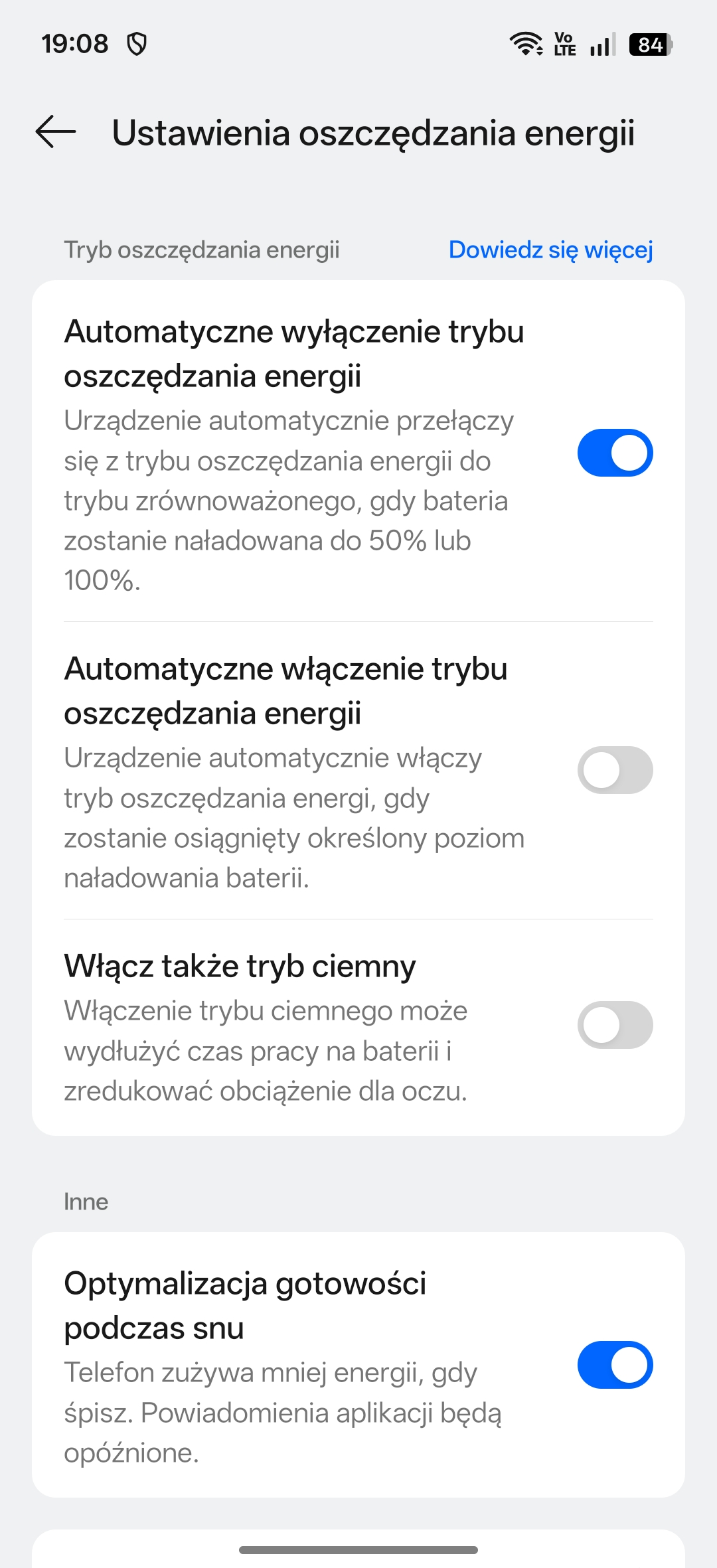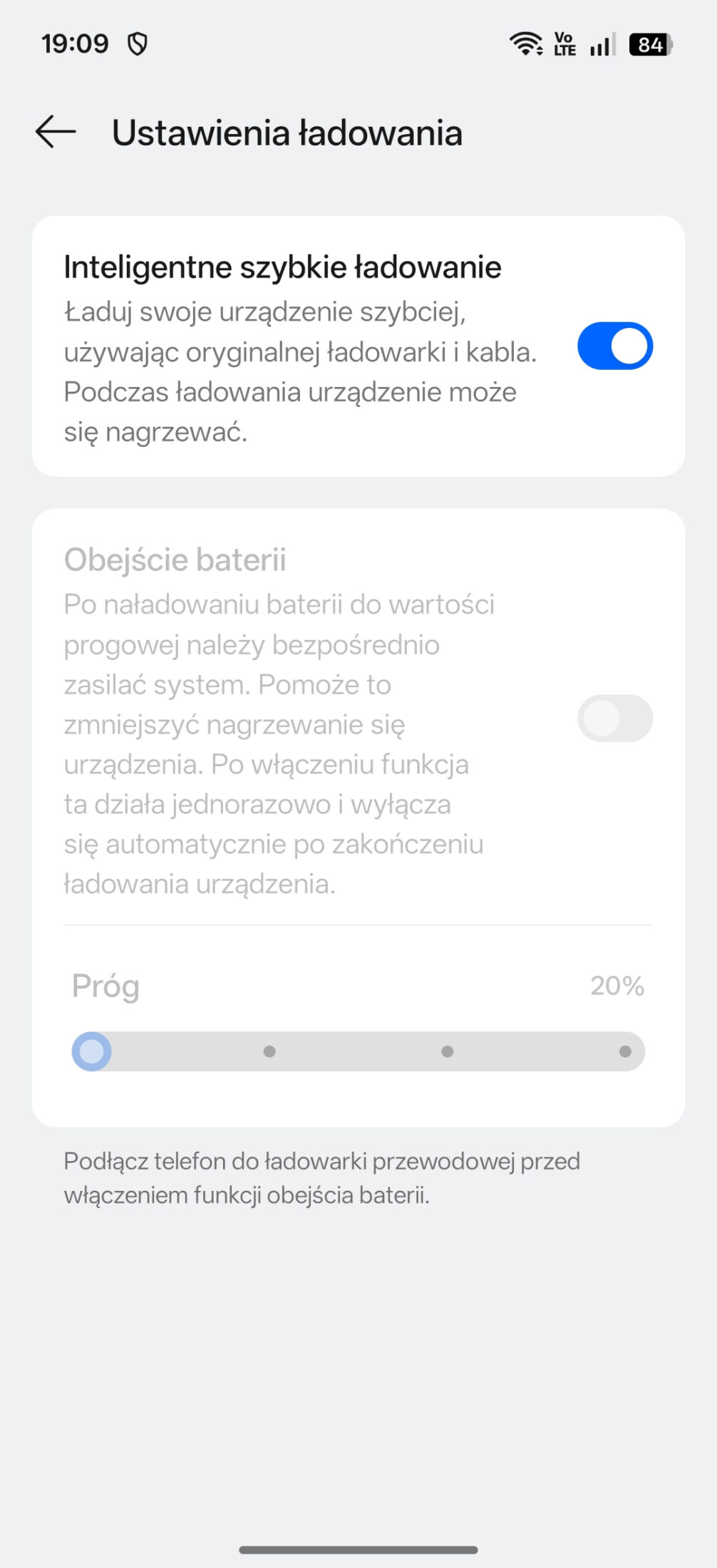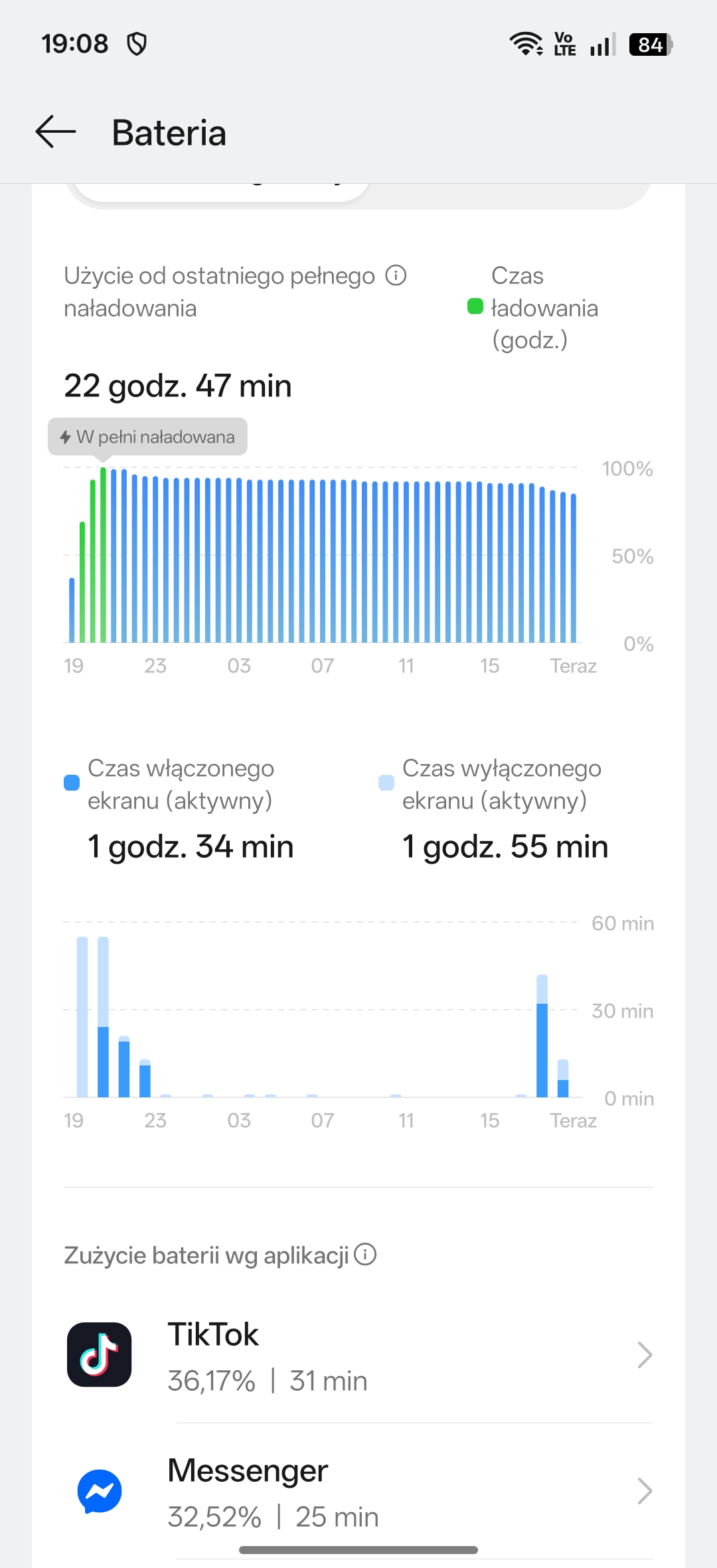 Model ten obsługuje szybkie ładowanie o mocy 80 W. Producent zapewnia pełne naładowanie od 1 do 100% w nieco ponad godzinę. Biorąc pod uwagę moje doświadczenia (czyli standardowe 20% do 100%) i kostkę ładująca, którą dysponuję, ładowanie zajmowało do 50 minut. Patrząc na pojemność baterii i czas jej ładowania naprawdę nie ma na co narzekać. Telefon nie obsługuje ładowania bezprzewodowego. Co prawda mam to w iPhonie i gdyby nie powerbank, który jest na takie właśnie ładowanie, nie korzystałabym z niego w ogóle. Smartfon obsługuje ładowanie zwrotne, więc jest to swego rodzaju ciekawostka w tym segmencie.