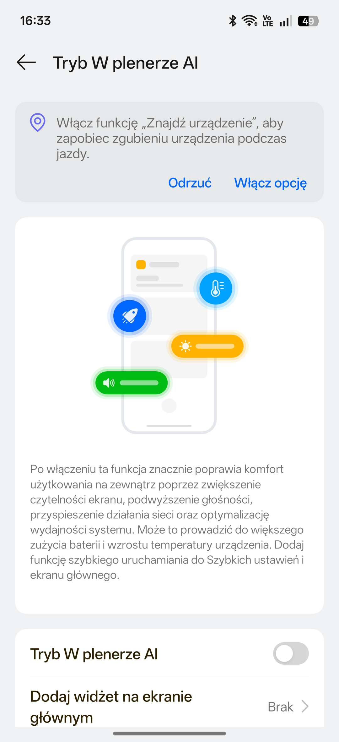 Telefon posiada również dedykowany tryb gamingowy. Kluczową rolę odgrywa w nim system GT Boost, który optymalizuje pracę procesora i GPU, poprawia płynność oraz stabilność klatek w grach i redukuje opóźnienia dotyku. Dodatkowo pojawiają się funkcje wspierane przez AI, takie jak “trener gamingowy”, który analizuje rozgrywkę i podpowiada, jak poprawić wyniki, oraz różne optymalizacje systemowe działające w tle.