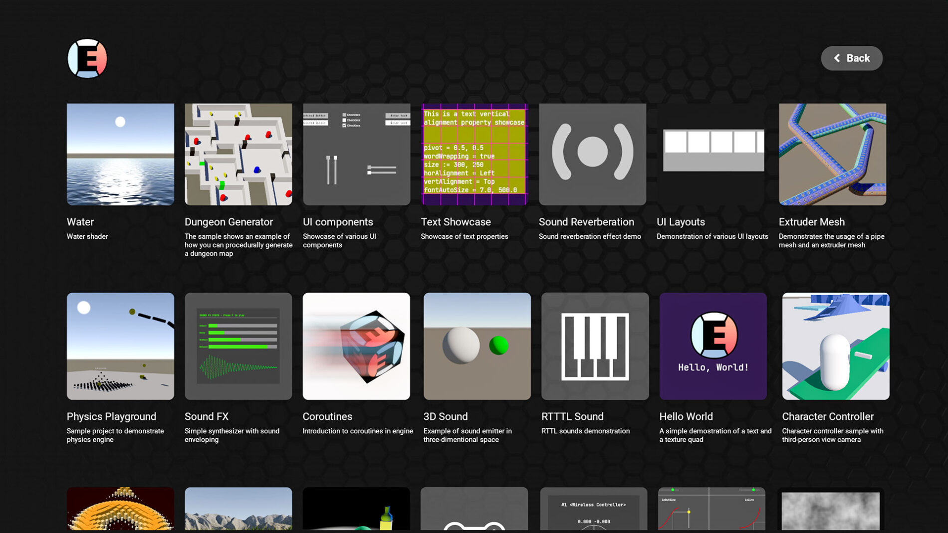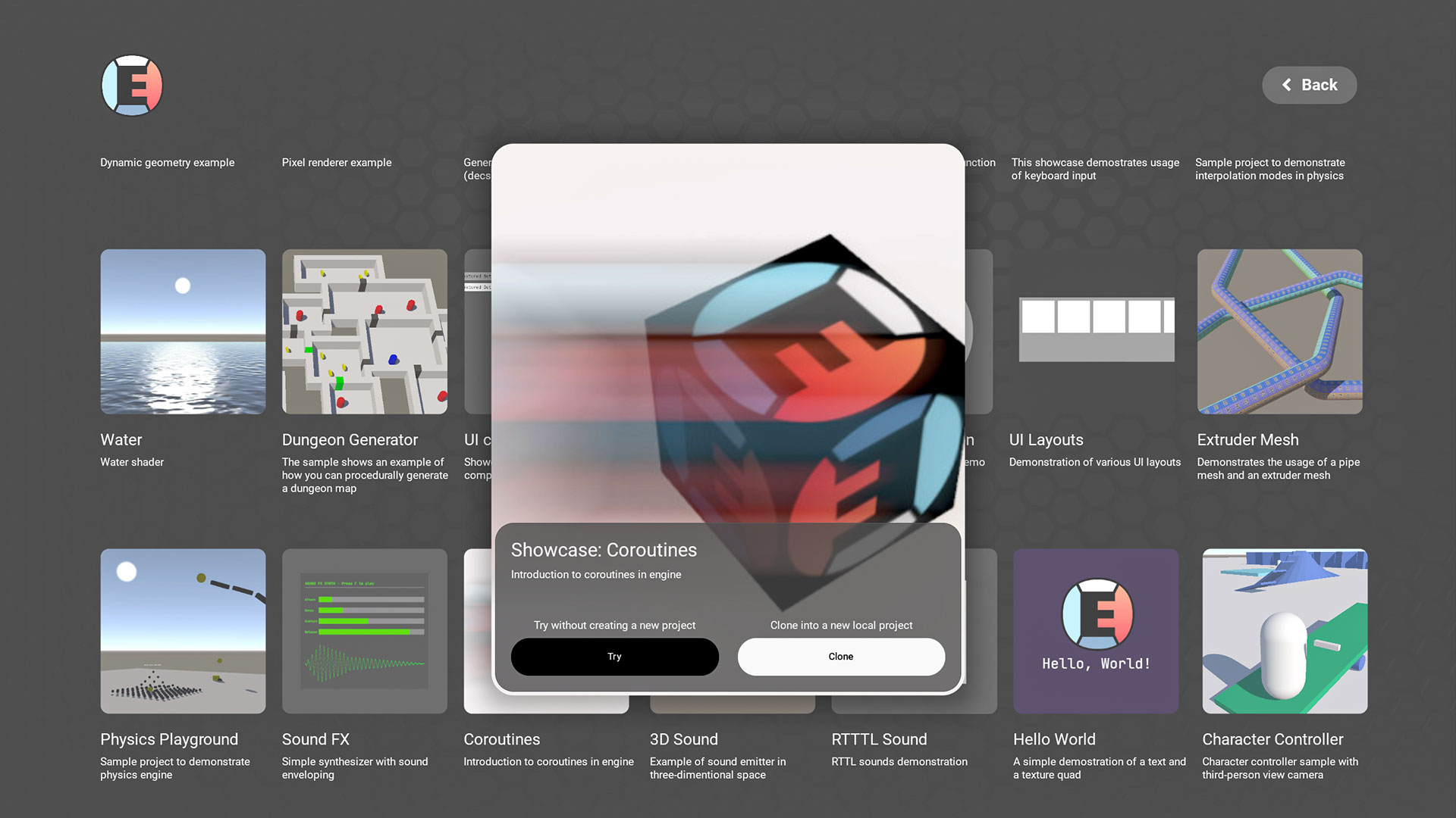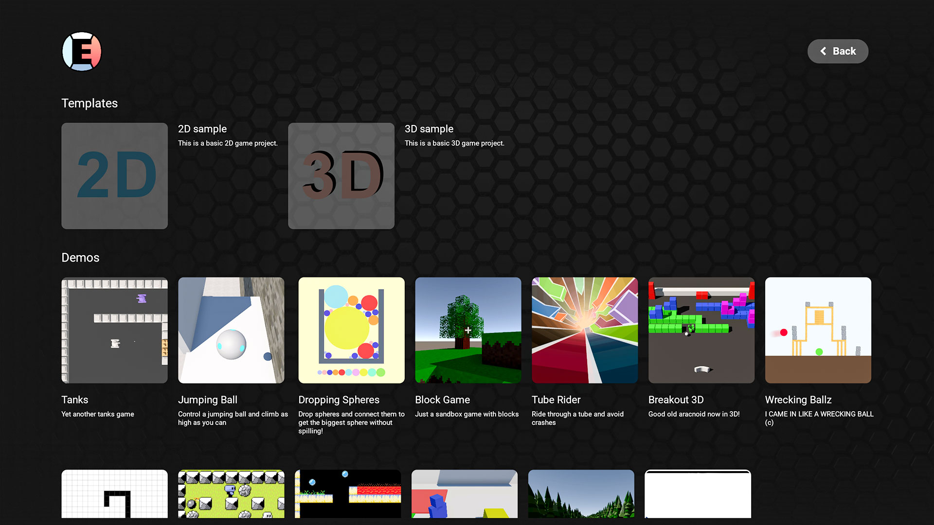 W ramach CBT dostępne są gry stworzone i opublikowane w EdenSpark. Pojawiają się tam zarówno własne projekty twórców, jak i prace innych testerów. Na platformie działa też sekcja szablonów z krótkimi demami prostych minigier z różnych gatunków. Takie przykładowe projekty często podpowiadają ciekawe rozwiązania; gdy któryś przyciągnie uwagę, jedno kliknięcie „Klonuj” pozwala zamienić go w bazę pod nową produkcję.