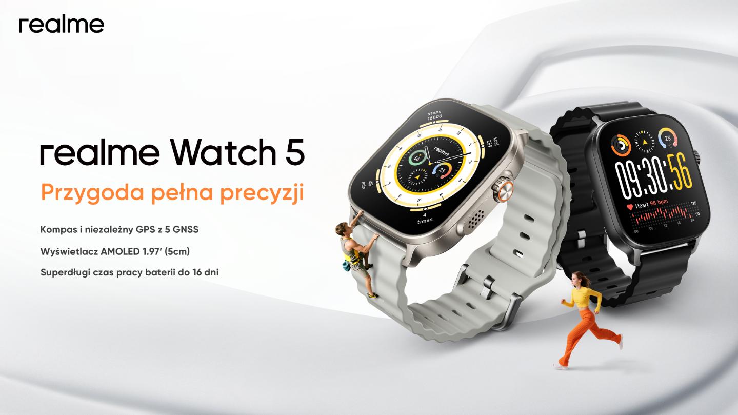 realme Watch 5 to nowoczesny smartwatch z dużym ekranem AMOLED, długim czasem pracy na baterii i ponad 100 trybami sportowymi.
